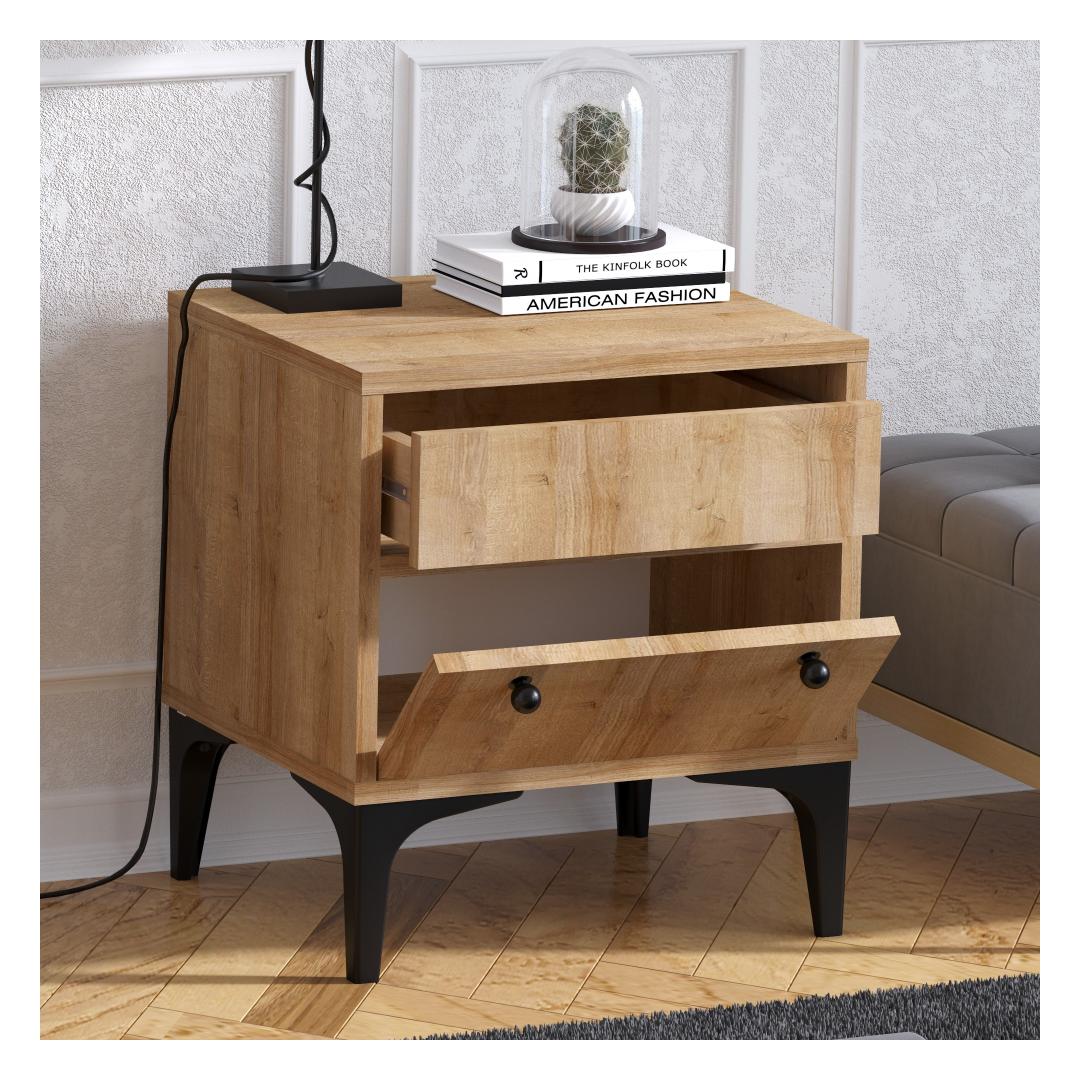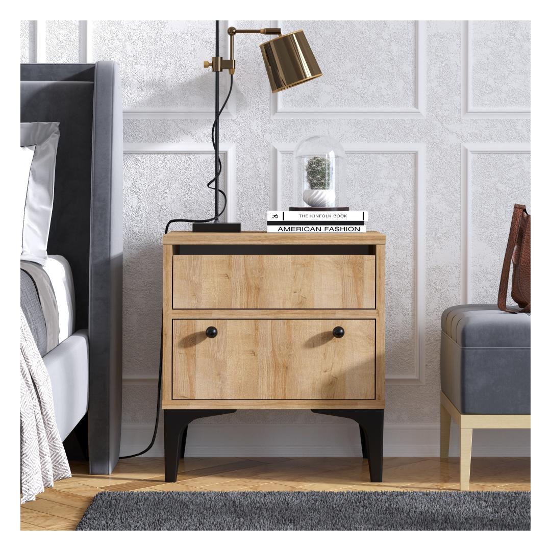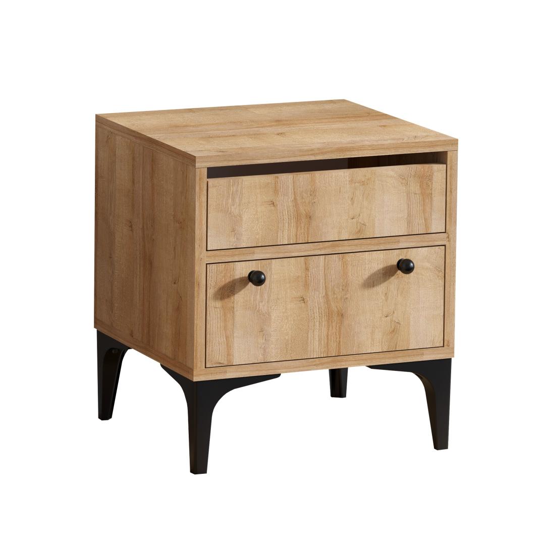 Võtke omaks industriaalse šiki trend meie öökapiga, mis on loodud selleks, et anda teie magamistoale ainulaadne ja ärevil tunne. Melamiiniga kaetud puitlaastplaadi ja plastikust jalgade kombinatsioon loob silmatorkava kontrasti, lisades traditsioonilisele kontseptsioonile kaasaegse pöörde.
