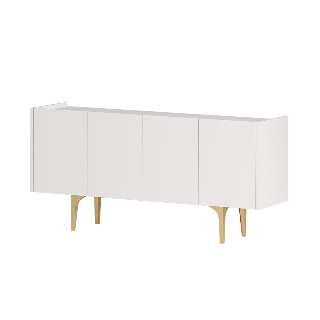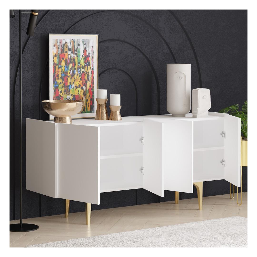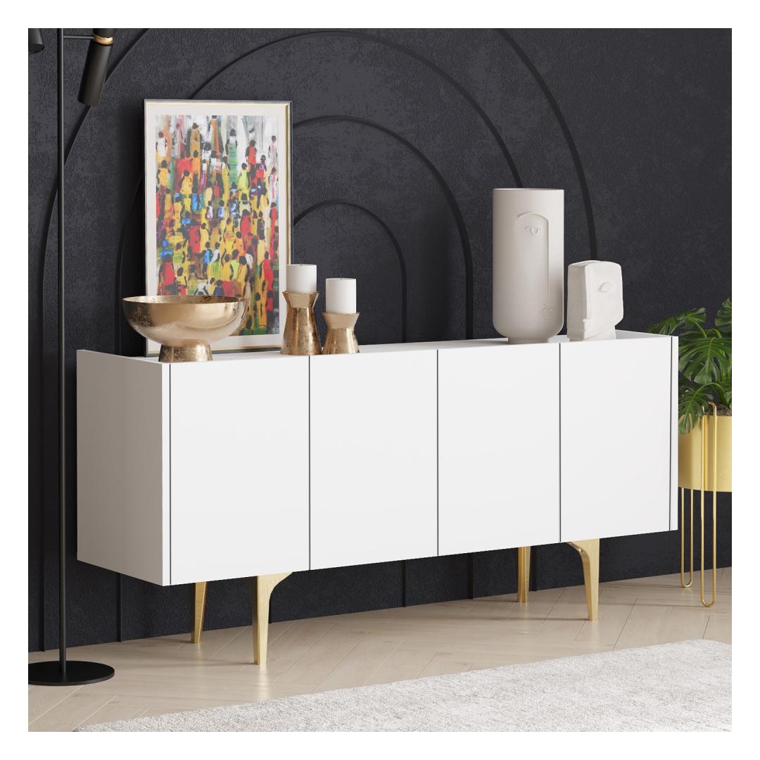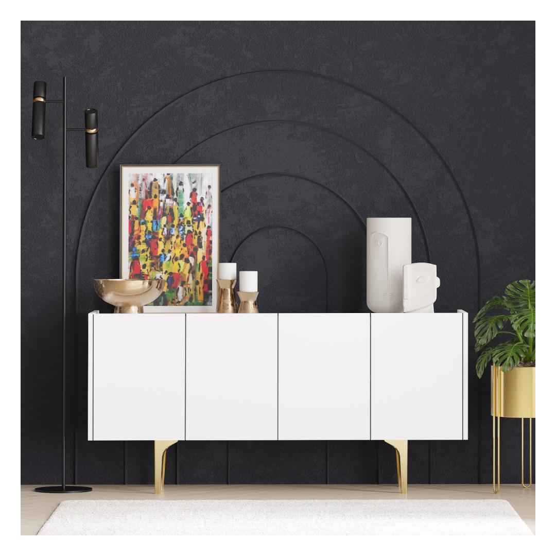 Astuge luksusse meie uimastava konsooliga, mis on valmistatud 100% melamiiniga kaetud puitlaastplaadist. Elegantne disain ja valge ja kuldse värvikombinatsioon tõstavad koheselt teie kodu mis tahes ruumi.