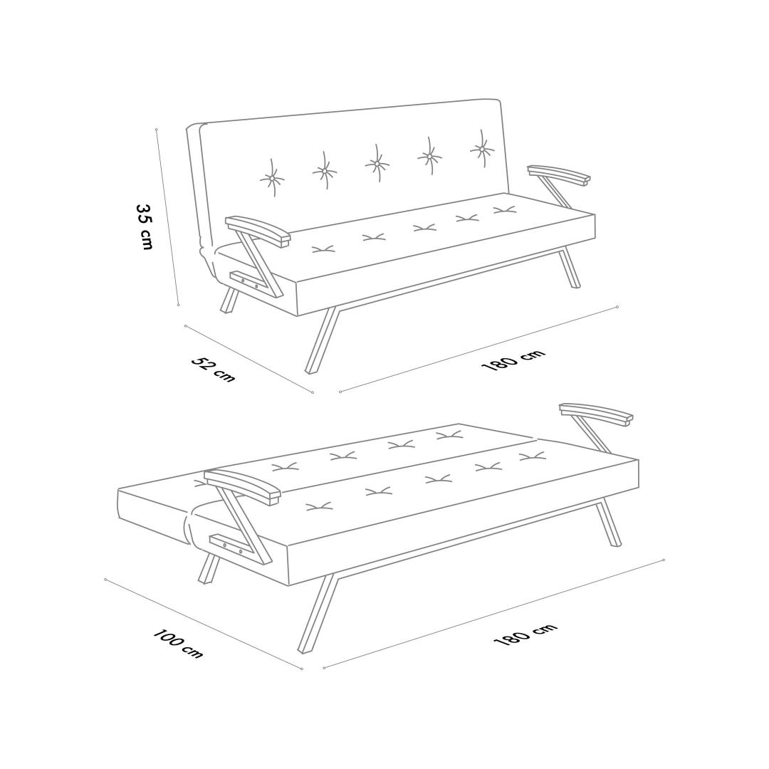 Istme laius on 180 cm ja voodi suurus 180 x 100 cm, mistõttu pakub see diivanvoodi piisavalt ruumi lõõgastumiseks või magamiseks. Puhastatav kangas muudab koristamise lihtsaks, samas kui metalljalad tagavad stabiilsuse ja toe. Diivanvoodil on ka lahtivõetavad jalad, mis muudavad transportimise ja kokkupaneku lihtsaks, muutes selle mugavaks valikuks igasse koju.