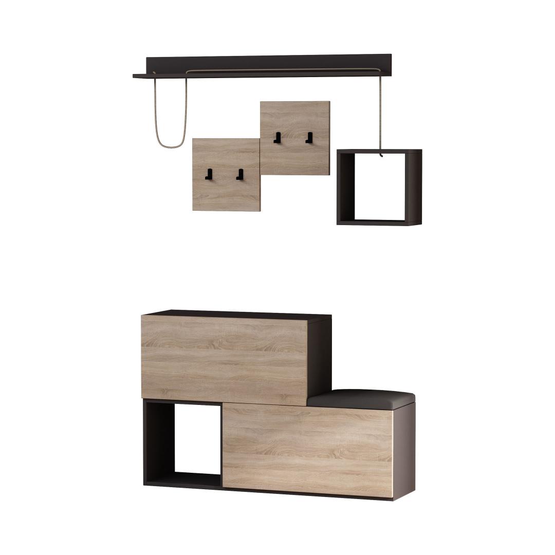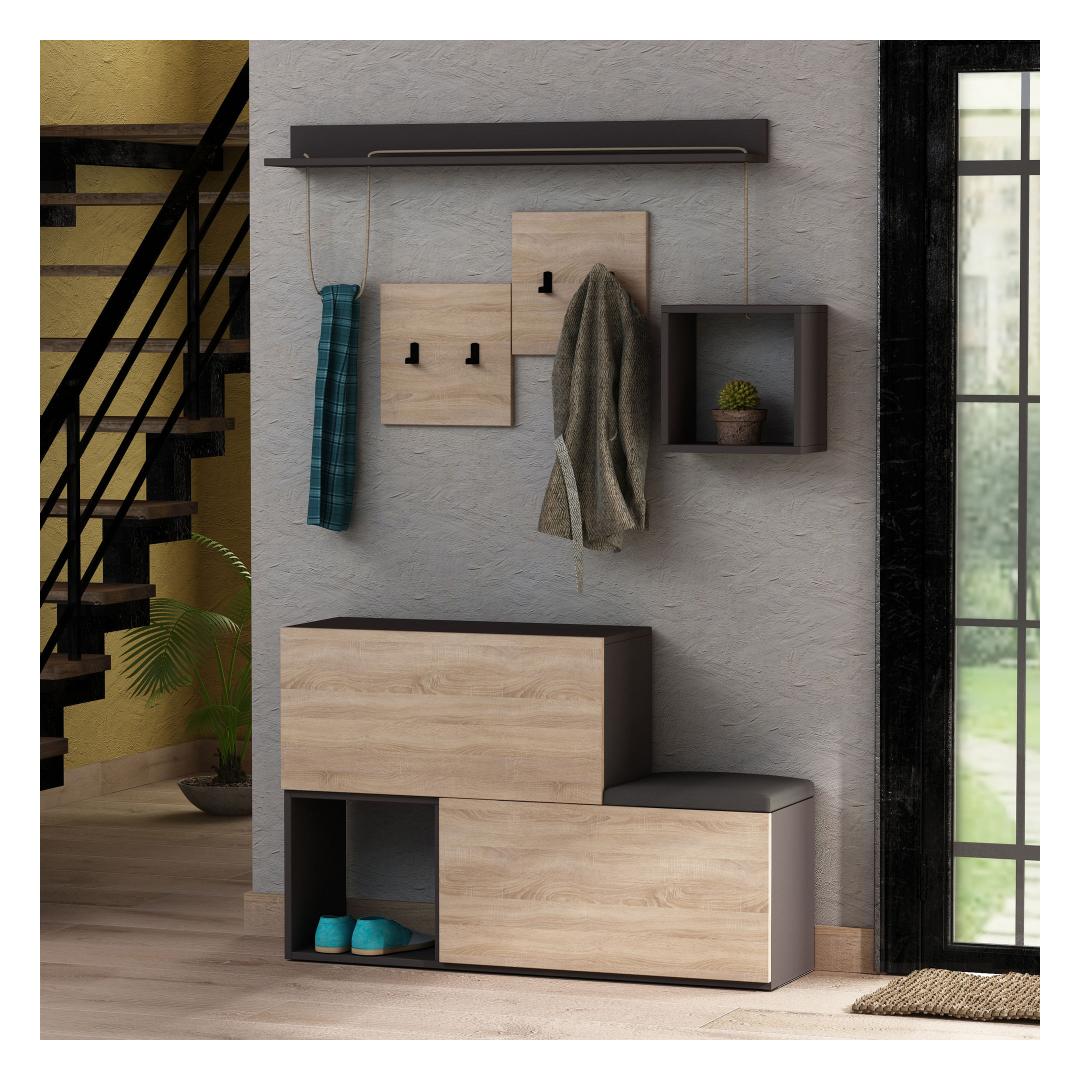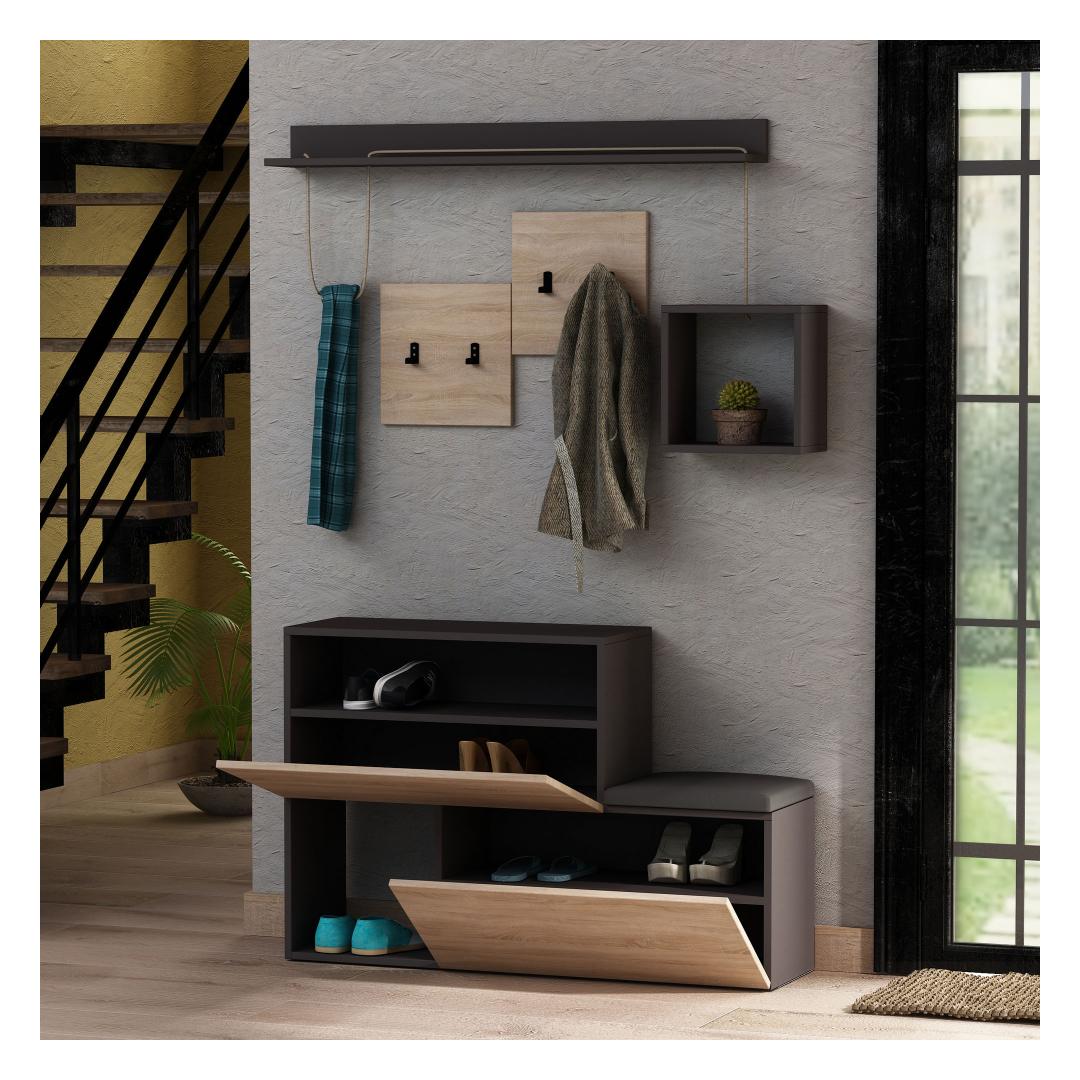 Esiku riidepuu sujuv disain antratsiidi ja tamme värvitoonides lisab igasse ruumi kaasaegse nüansi. Ruudukujuline seinariiul on ideaalne teie lemmik dekoratiivesemete väljapanekuks, lisades isikupära teie esikule.