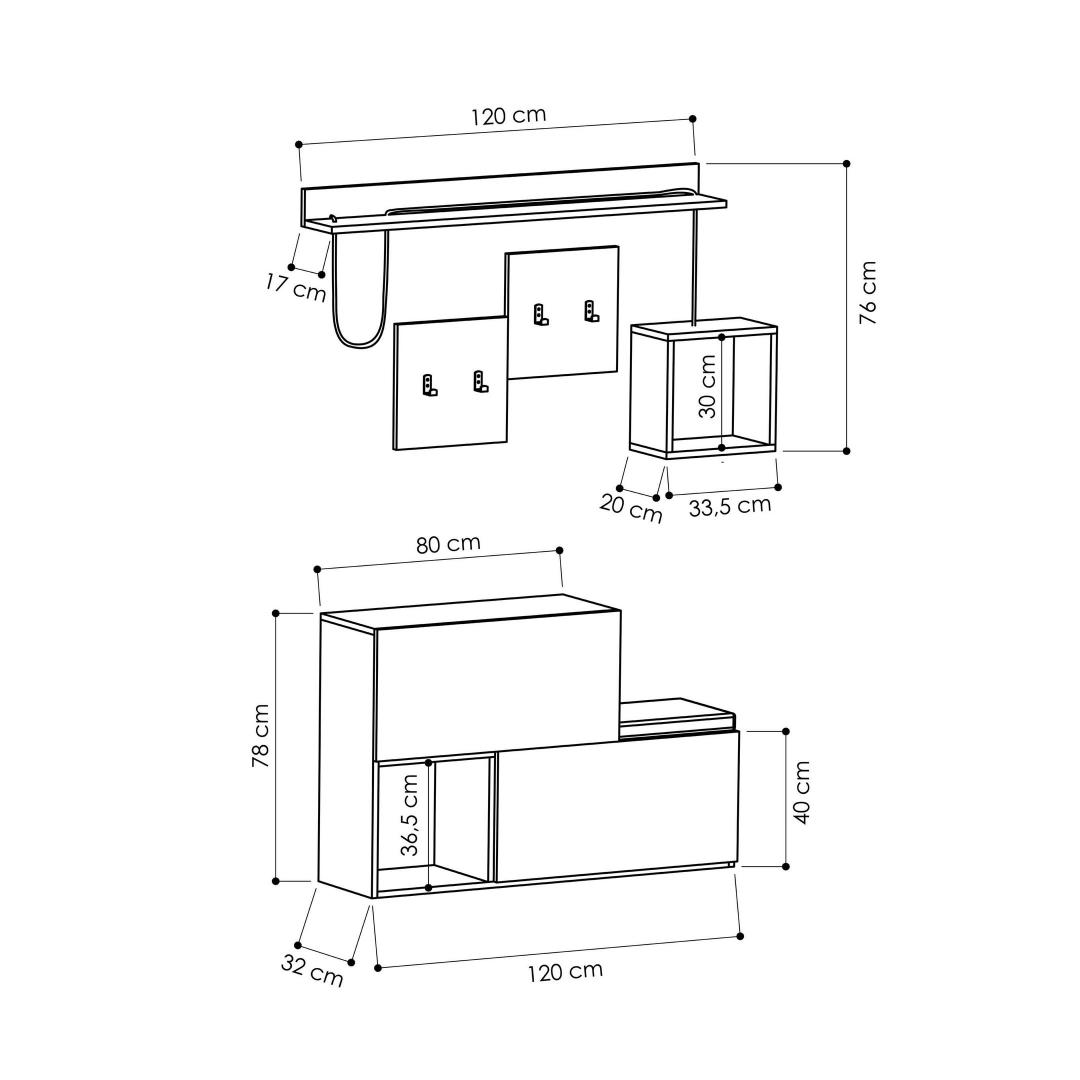 - Jalanõude kapi suurus: Laius: 120 cm, Kõrgus: 78 cm, Sügavus: 40 cm