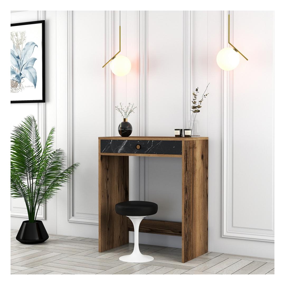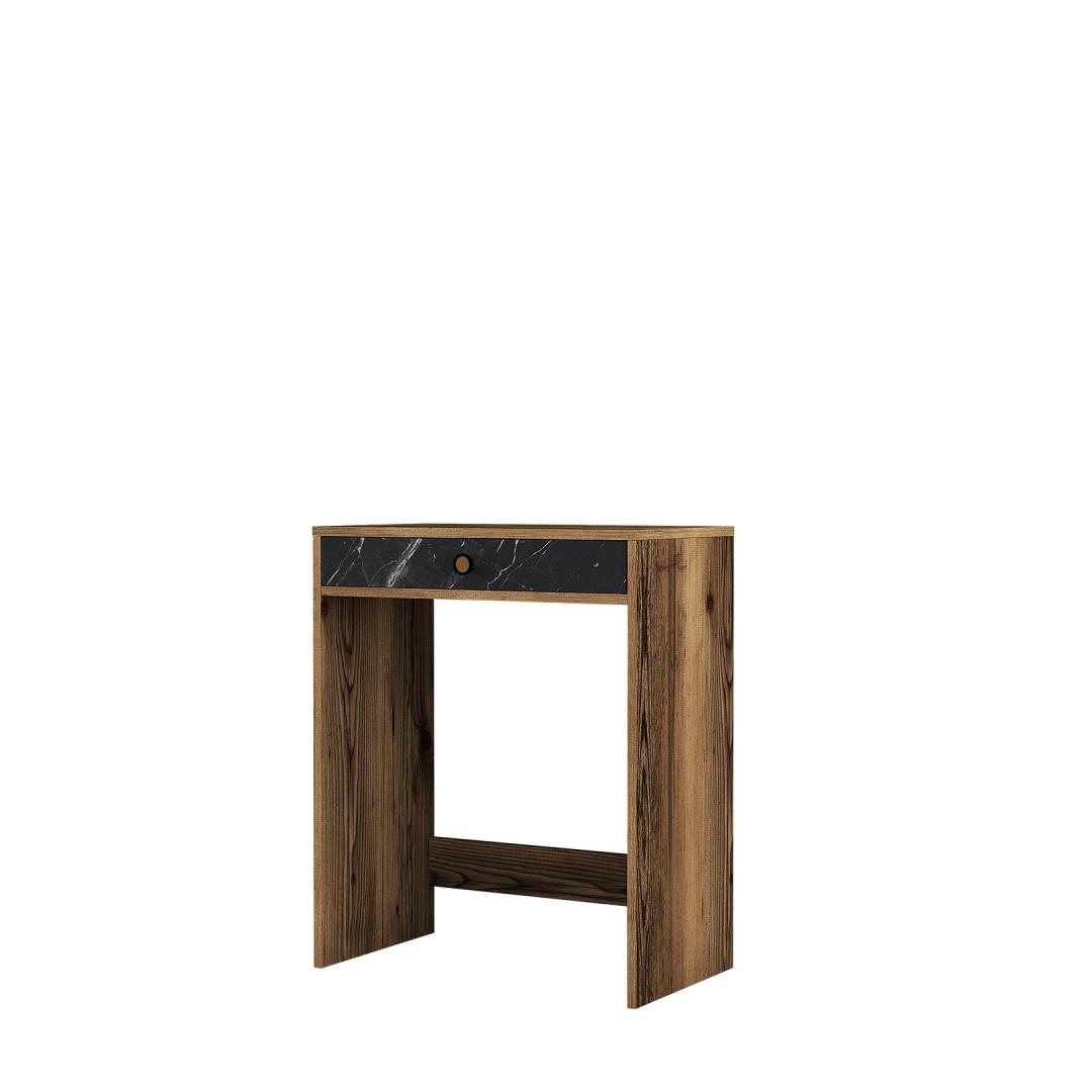 Meie meigilaud on valmistatud hoolikalt ja detailidele tähelepanu pöörates ning selle elegantse ja moodsa disainiga laud kaunistab vaevata mis tahes ruumi. Pähklipuu, musta ja marmori värvide kombinatsioon loob silmatorkava visuaalse atraktiivsuse, muutes selle tõeliseks väljapaistvaks esemeks.