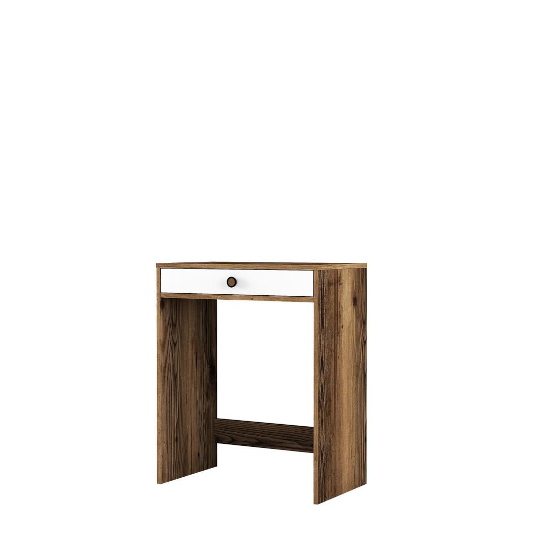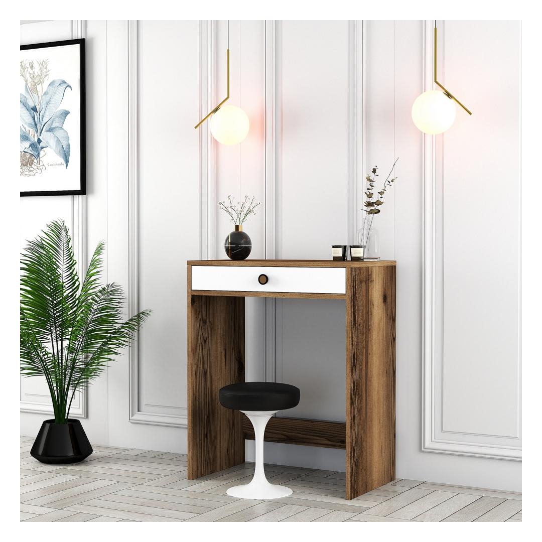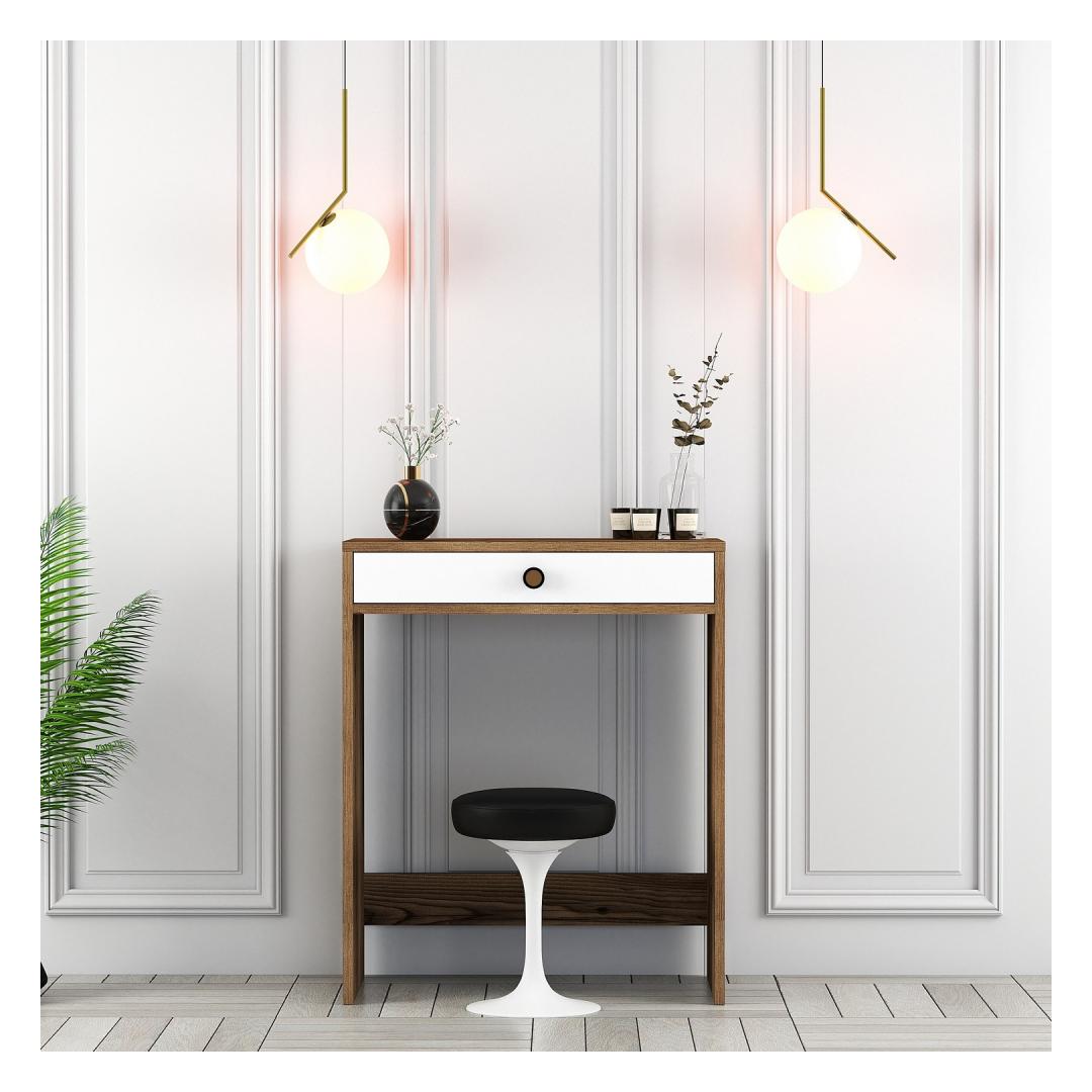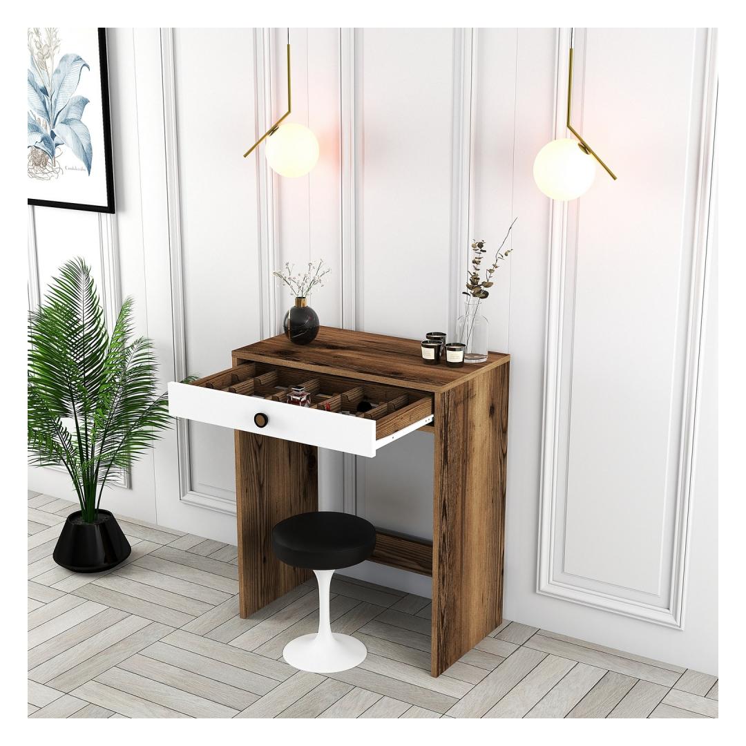 Meie meigilaud on valmistatud ülima hoole ja tähelepanuga detailidele ning see õhkab elegantsi ja elegantsust. Rikkaliku pähklipuu ja põlise valge värvi kombinatsioon loob harmoonilise segu, mis täiendab vaevata mis tahes sisekujundust. Selle elegantne ja moodne disain lisab teie tuppa glamuuri, mis paneb teid tundma end tõelise ilukuningannana.