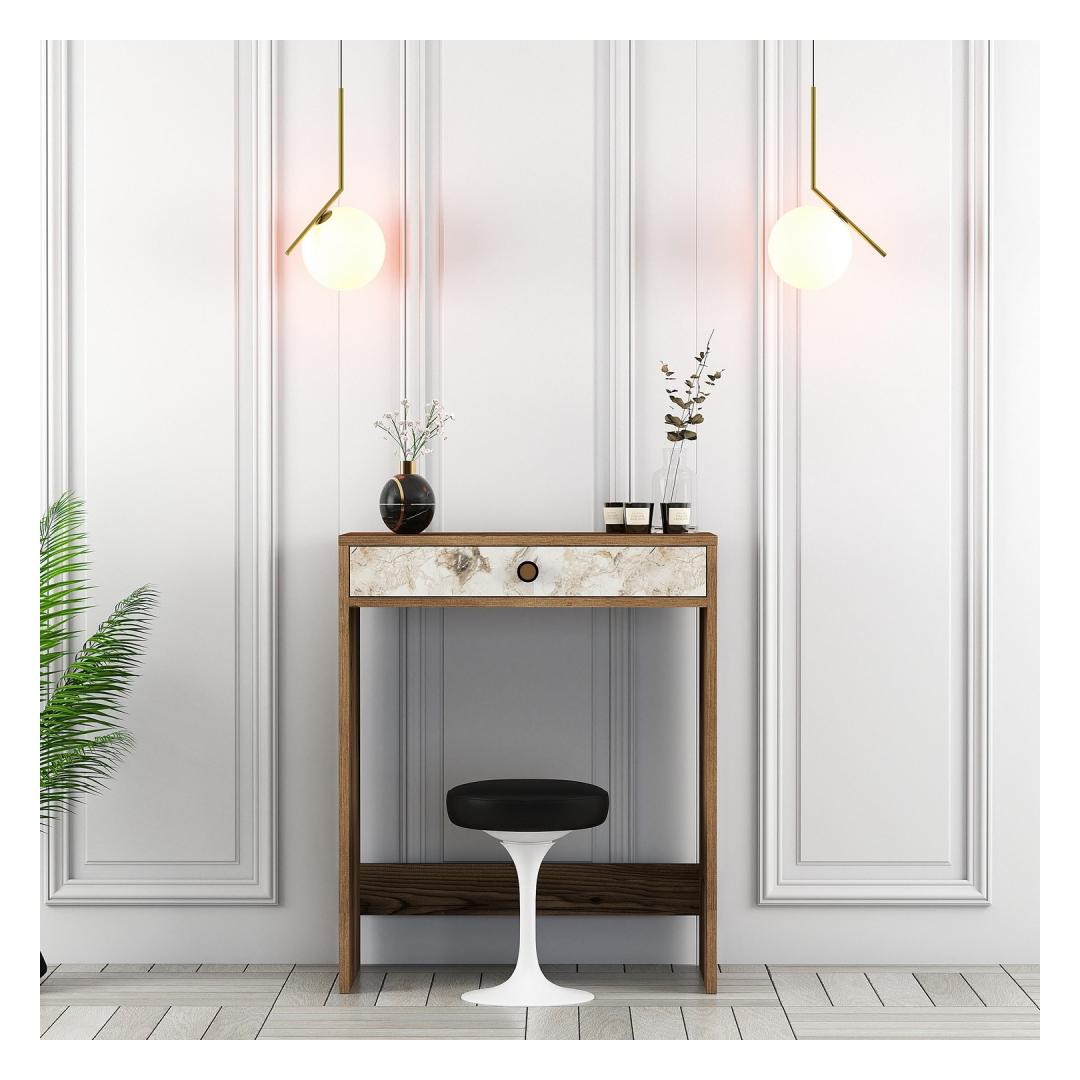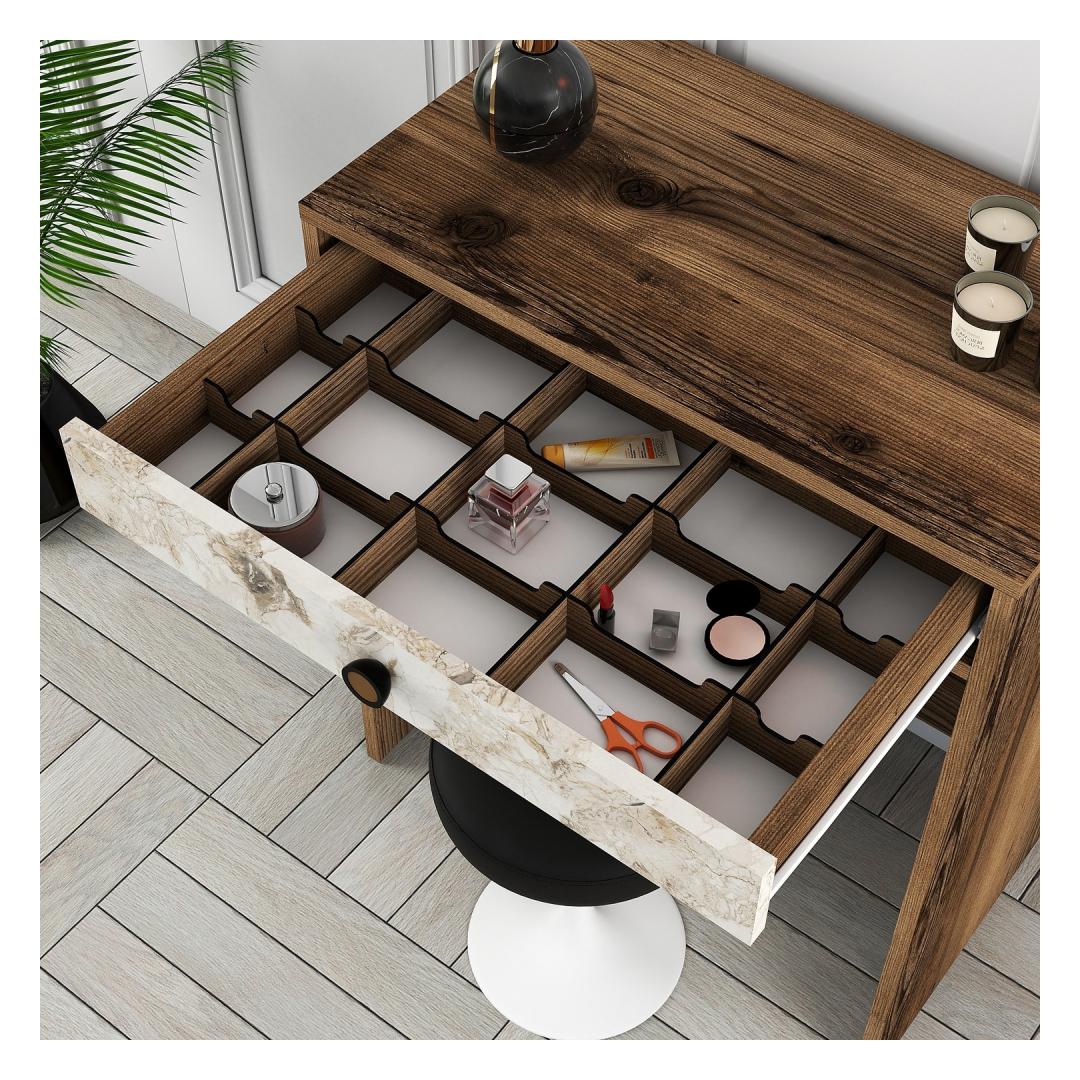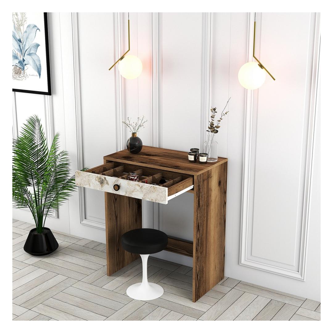 Pähklipuu, valge ja marmorist värvide paeluv segu, meie meigilaud täiendab vaevata mis tahes sisekujundust. Nende toonide harmooniline kombinatsioon loob visuaalselt uimastava eseme, millest saab teie toa keskpunkt.