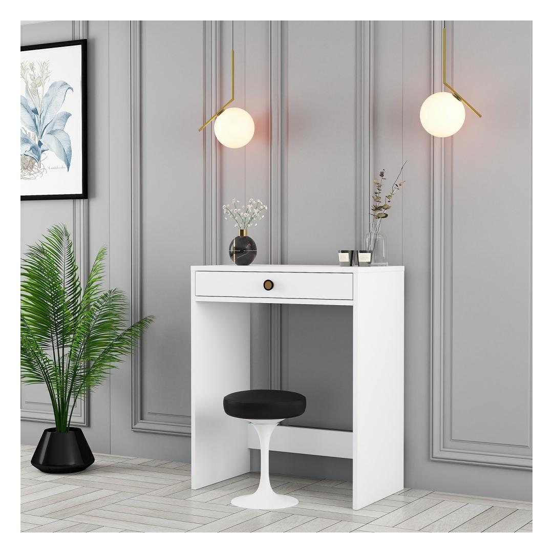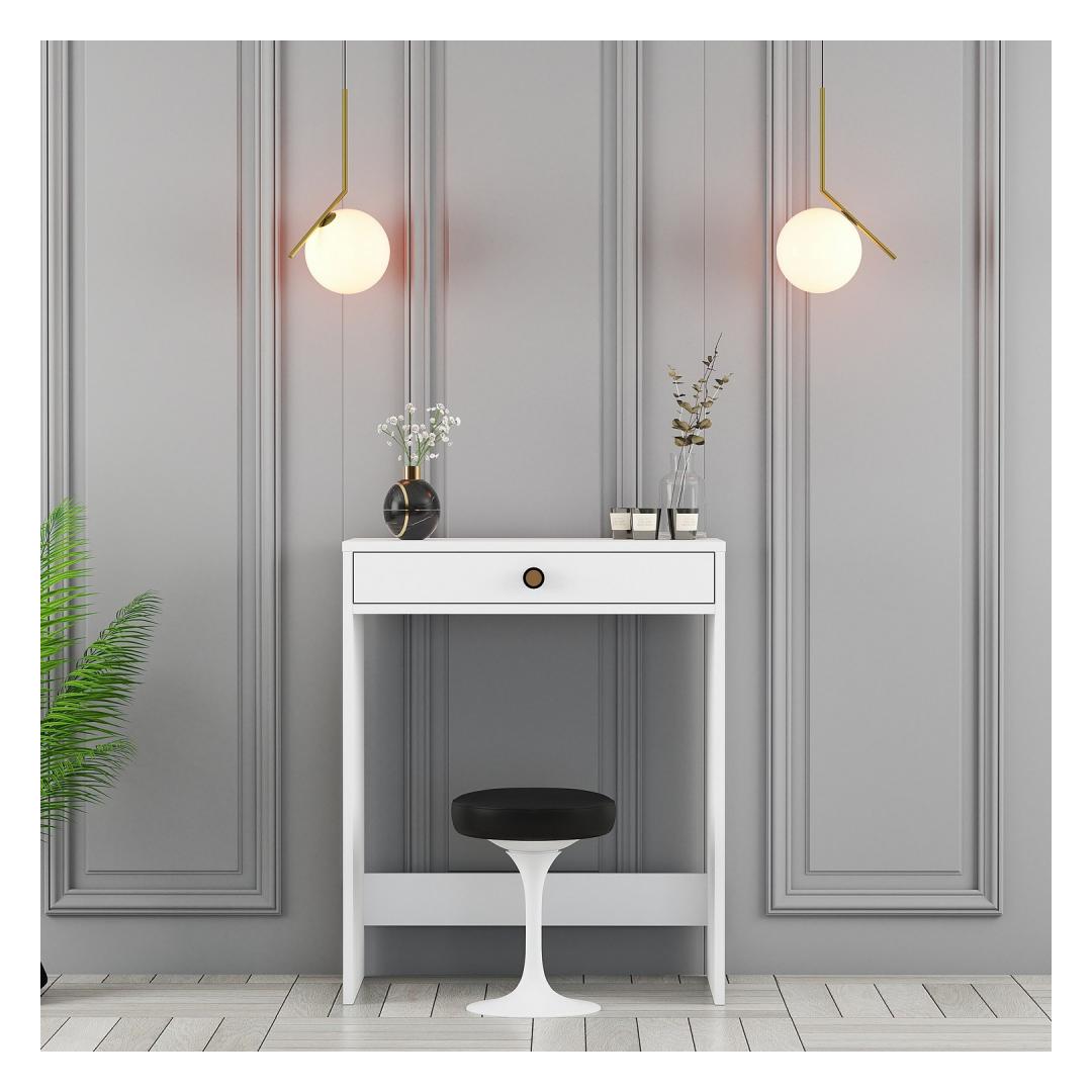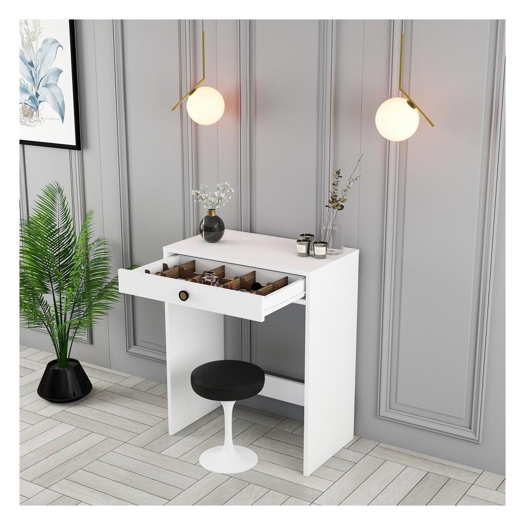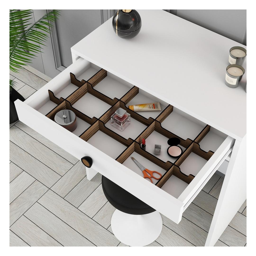 Meie meigilaua puhas ja karge valge värvus lisab teie ruumile puhtuse ja rahulikkuse tunnet, luues rahulikku keskkonda, kus saate keskenduda oma ilurutiinile. Ükskõik, kas paigutate selle oma magamistuppa, vannituppa või garderoobi, see laud sulandub vaevata mis tahes sisustusstiiliga, muutes selle ideaalseks täienduseks teie kodule.