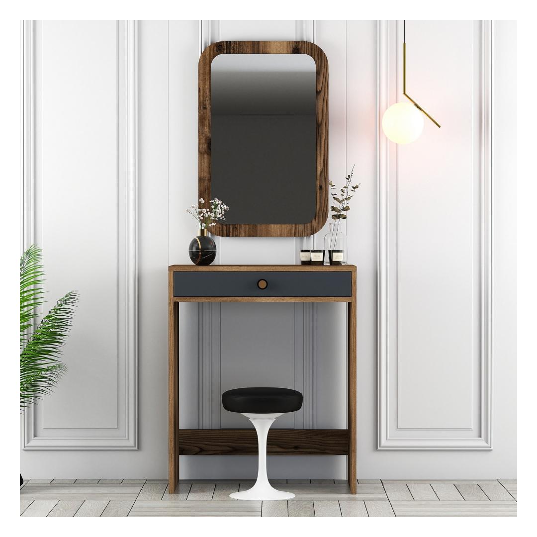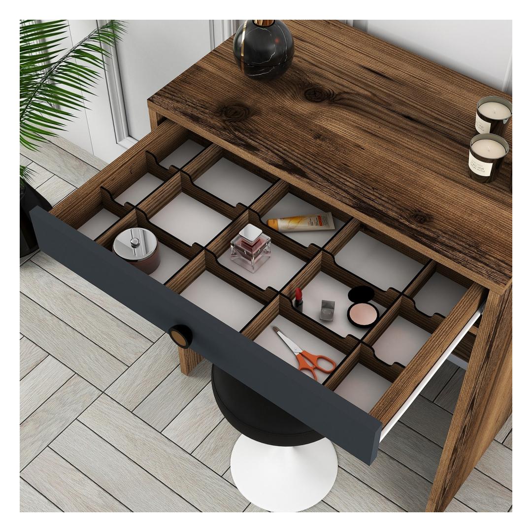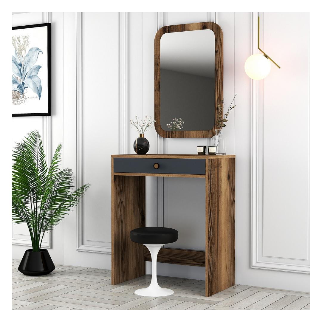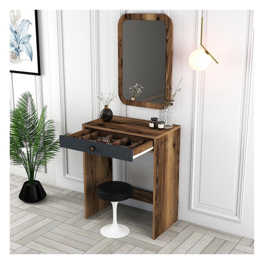 Meie meigilaud on disainitud nii, et see sobitub sujuvalt mis tahes sisustusega. Pähklipuu ja antratsiidi värvide kombinatsioon loob uimastava kontrasti, mis lisab teie ruumile rafineeritust. Olenemata sellest, kas teie stiil on modernne või traditsiooniline, see meigilaud täiendab kindlasti teie esteetikat ideaalselt.