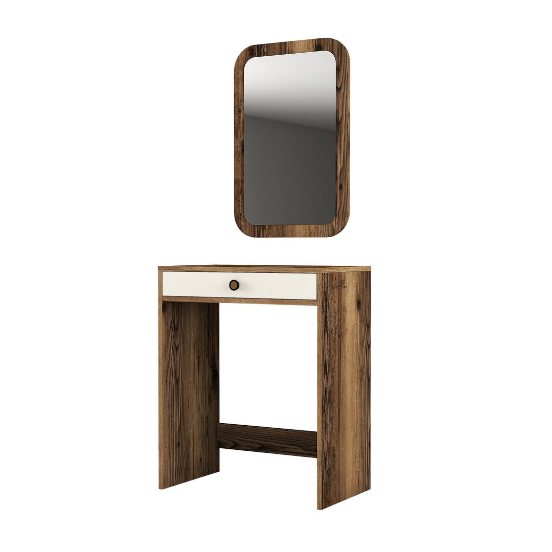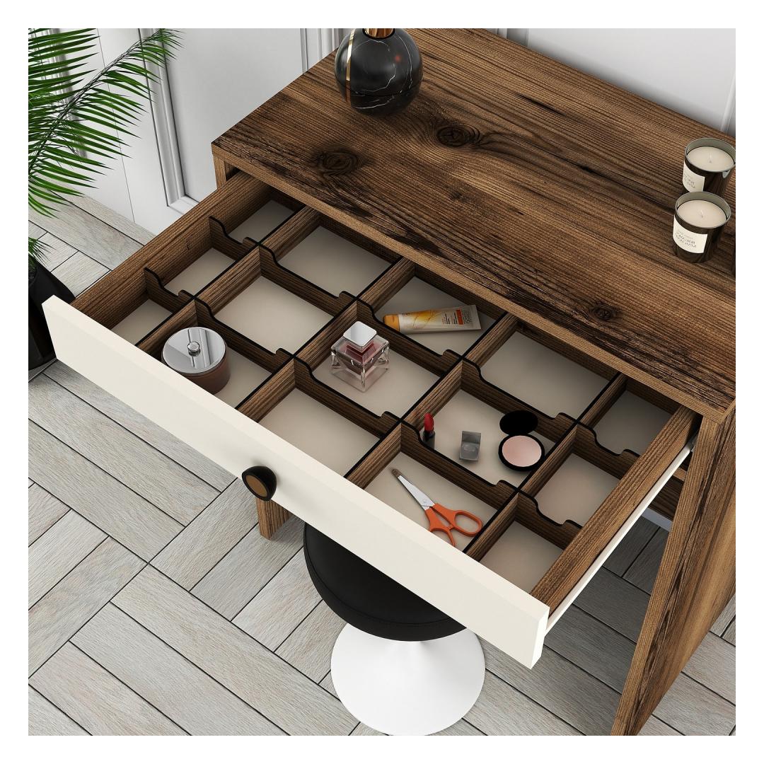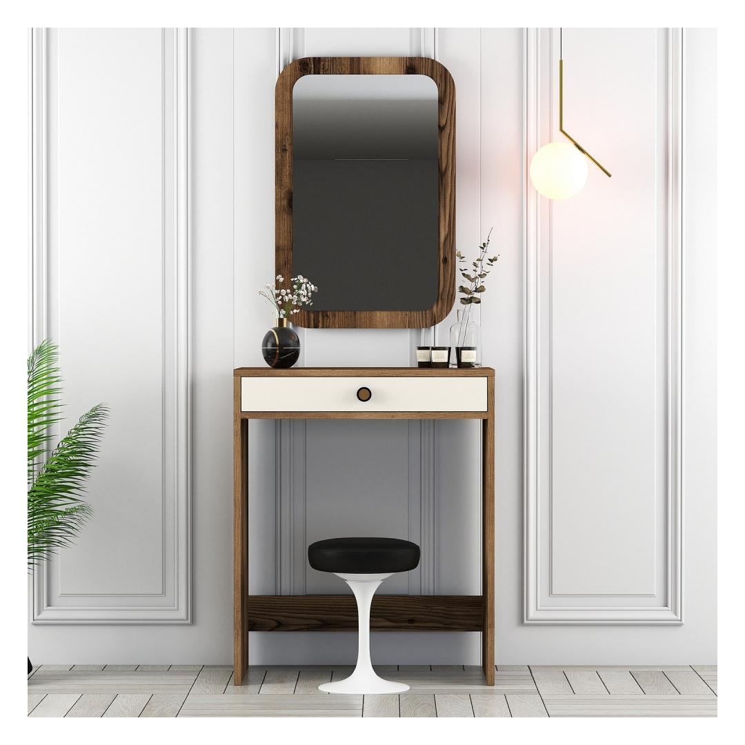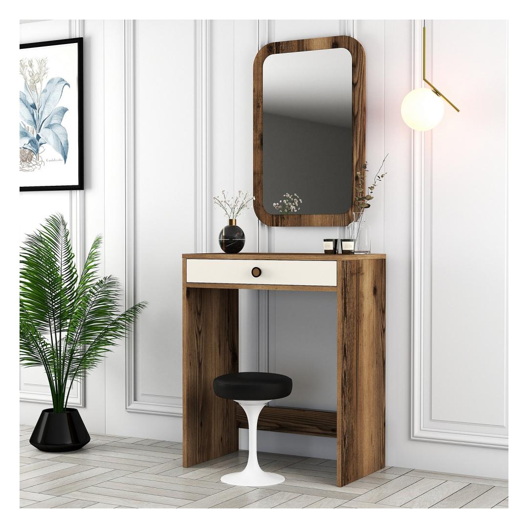 Meie meigilaual on avar lauaplaat, mis pakub piisavalt ruumi kõigile teie ilutarvikutele. Kaasasolev peegel lisab glamuuri ja võimaldab teil oma välimust hõlpsasti täiustada. Pähklipuu ja kreemi värvikombinatsioon lisab igale ruumile elegantsi, luues rahulikku ja kutsuvat atmosfääri.