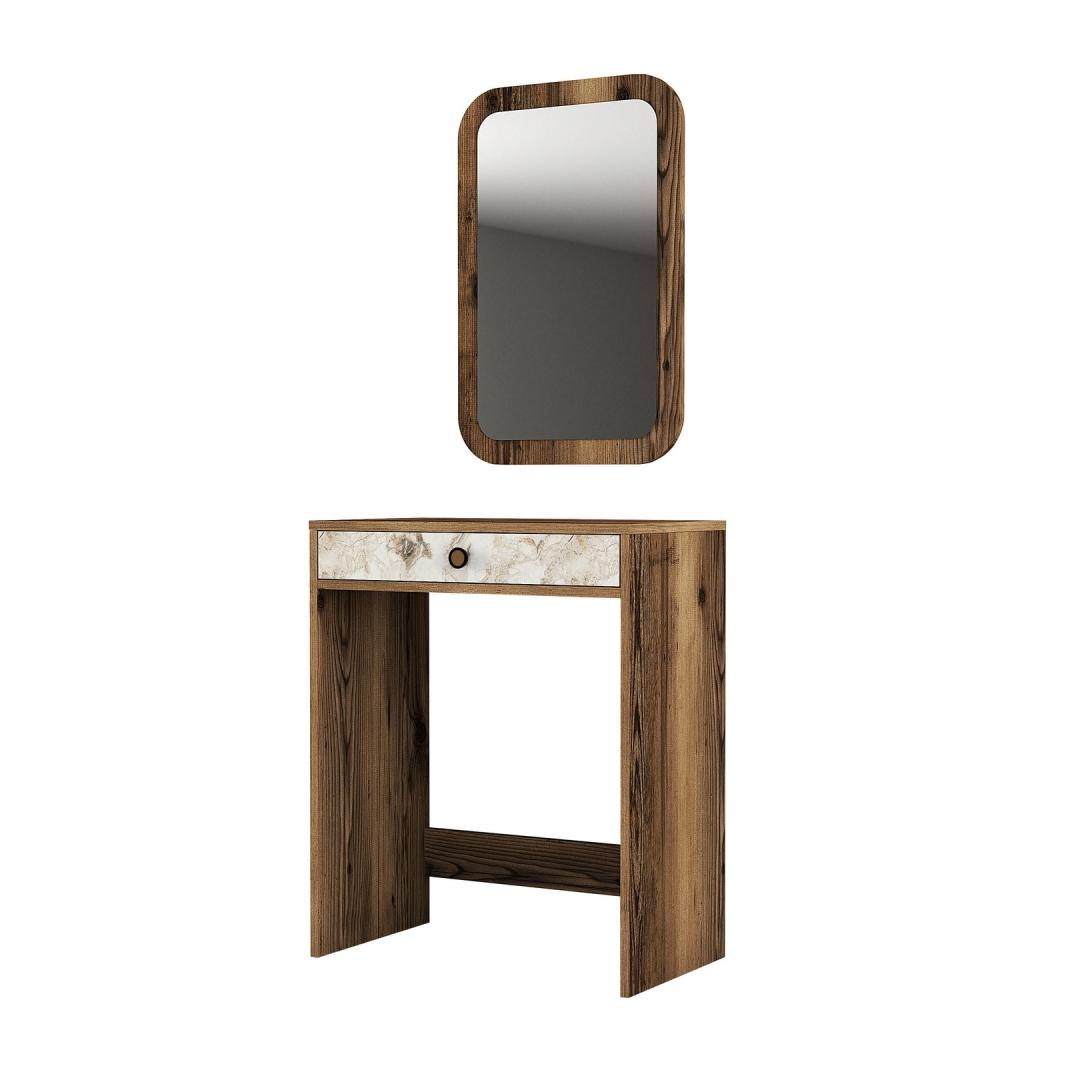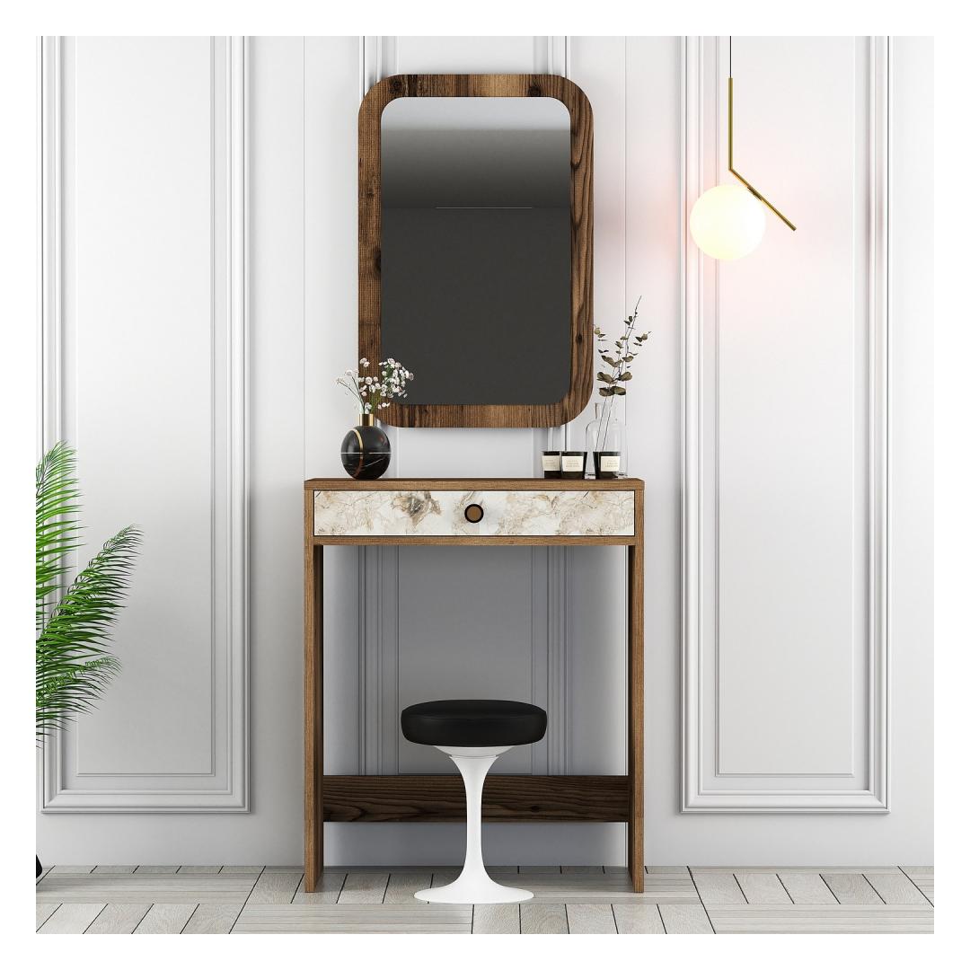 Tänu oma elegantsele disainile ja pähklipuu, valge ja marmori elegantsele värvikombinatsioonile lisab meie meigilaua elegantsust igasse magamistuppa või garderoobi. Tänu oma kompaktsele suurusele sobib see ideaalselt väiksematesse ruumidesse, pakkudes samas piisavalt hoiu- ja tööruumi.
