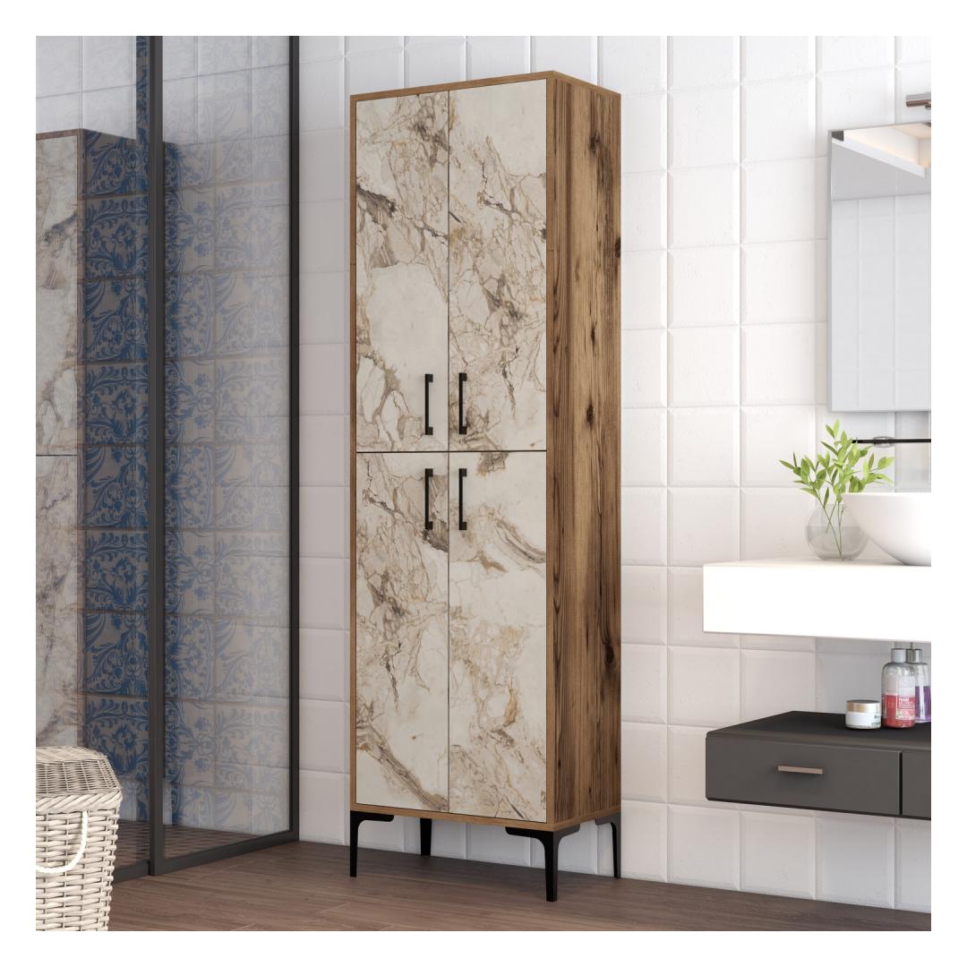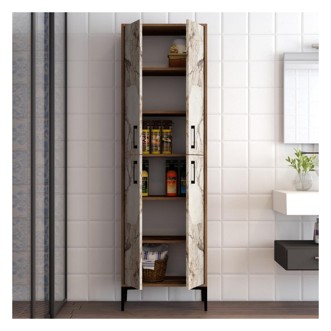 100% melamiiniga kaetud puitlaastplaadist valmistatud kapp on valmistatud kestma. 18 mm paksus tagab tugevuse ja stabiilsuse, samas kui metalljalad, käepidemed ja riputuskangid lisavad elegantse ja moodsa puudutuse. Pähklipuu ja valge värvikombinatsiooniga sulandub see kapp vaevata mis tahes sisustusstiiliga.