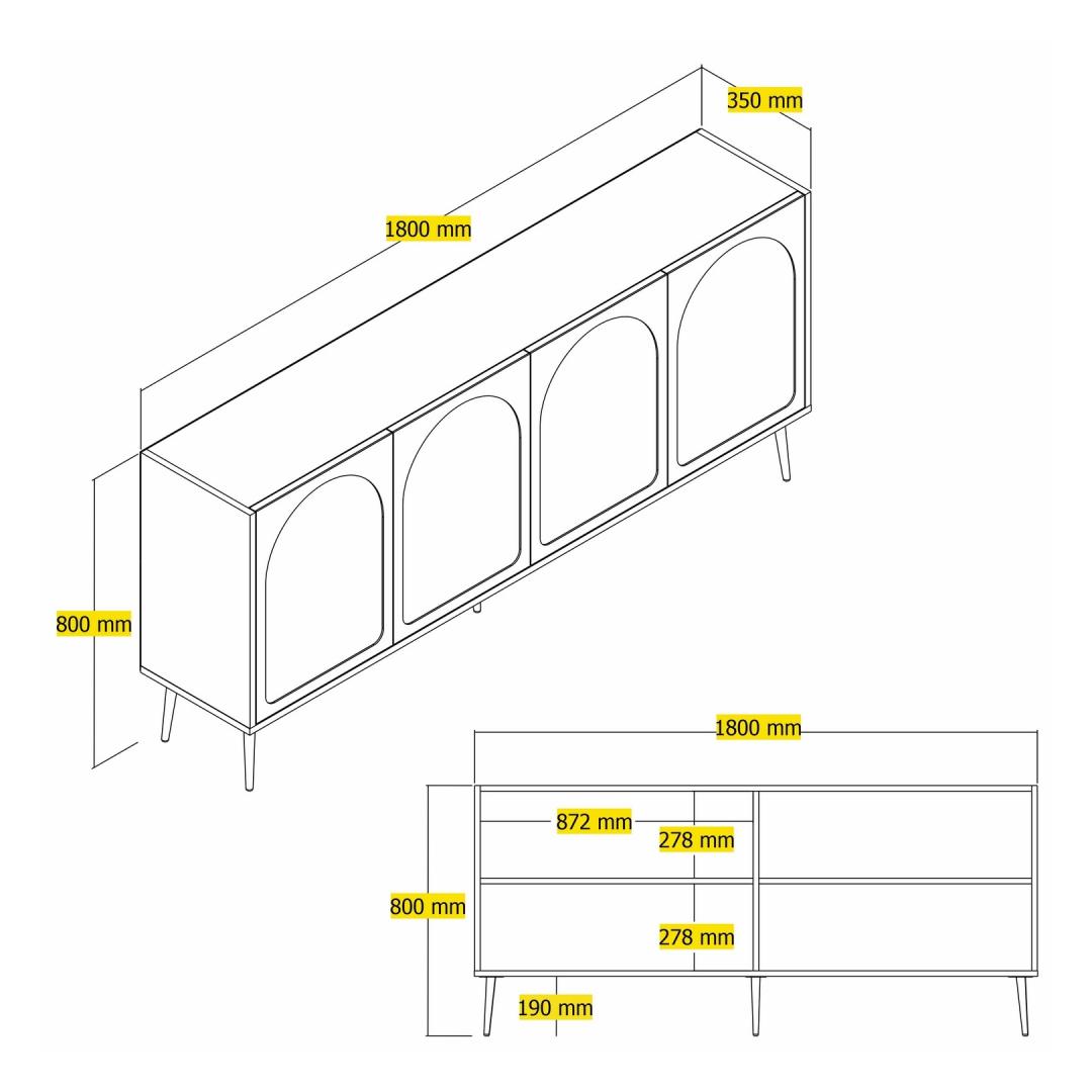 See konsool ei näe mitte ainult ilus välja, vaid pakub ka piisavalt ruumi kõigi oluliste asjade jaoks. 18 mm paksune puitlaastplaat tagab vastupidavuse ja pikaealisuse, nii et saate sellest esemest rõõmu tunda aastaid. Avarate mõõtmete (180 cm x 80 cm x 35 cm) tõttu sobib see ideaalselt teie lemmikdekoratsioonide eksponeerimiseks või igapäevaste esemete hoidmiseks.