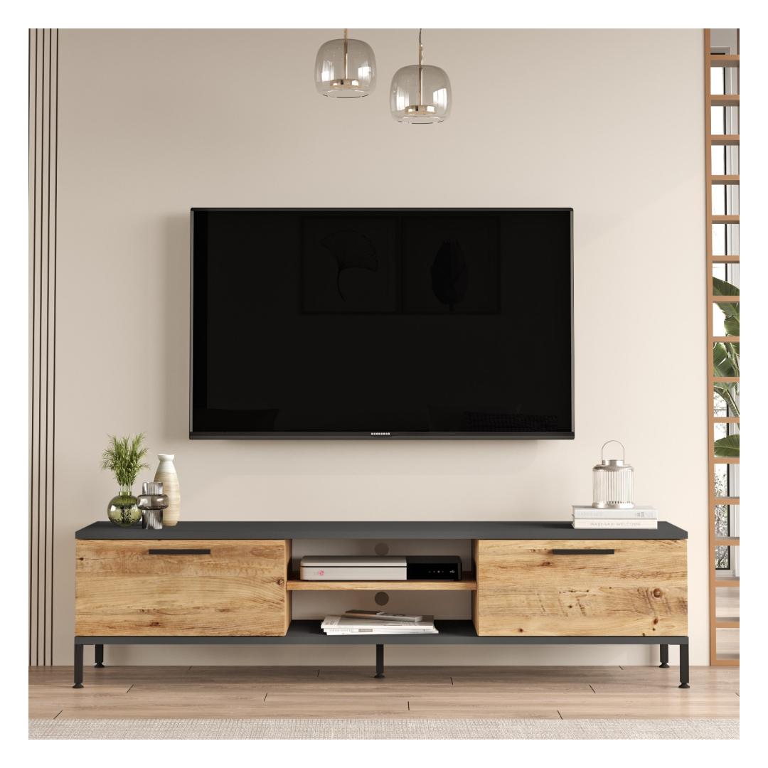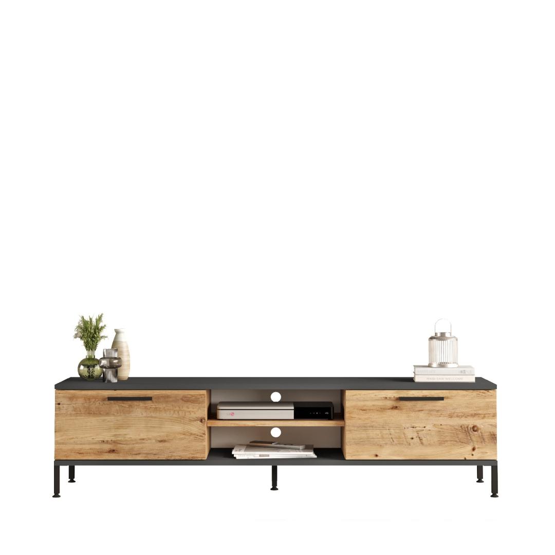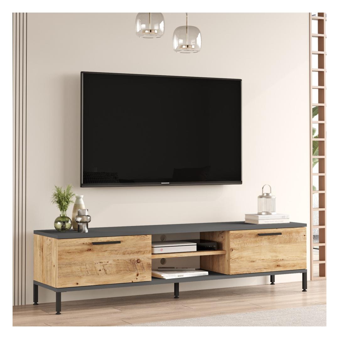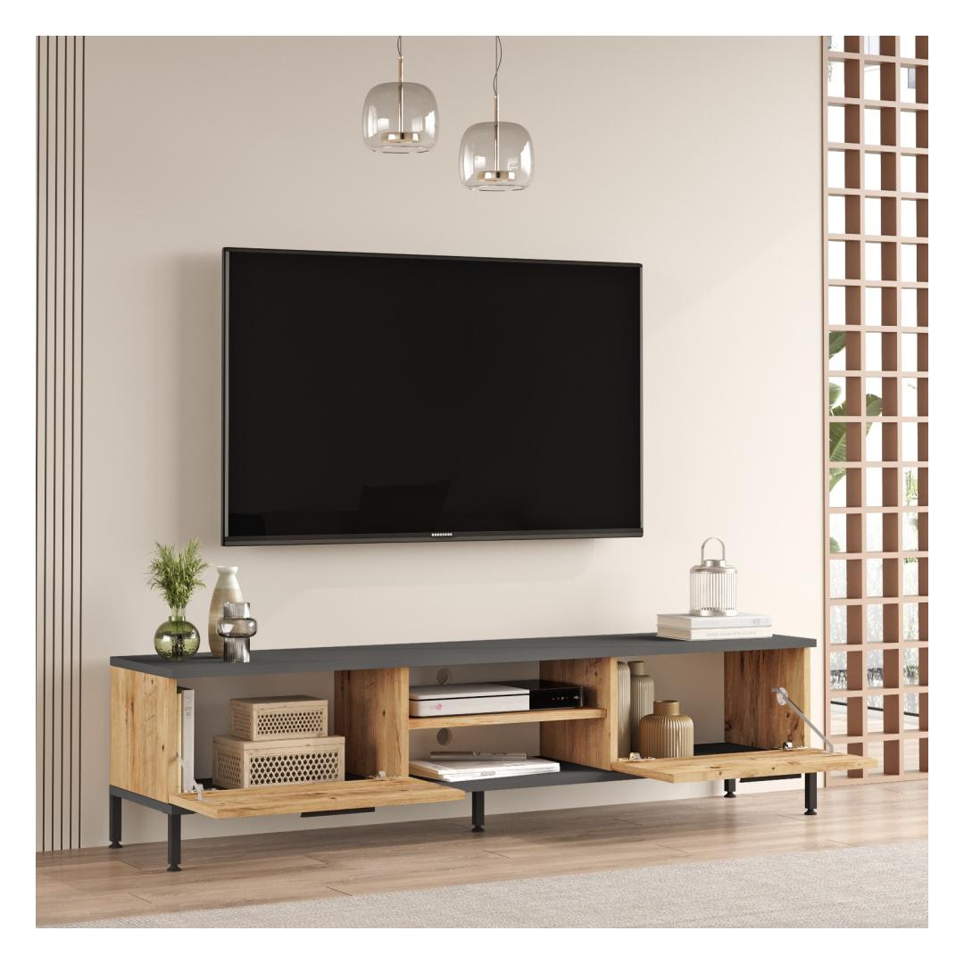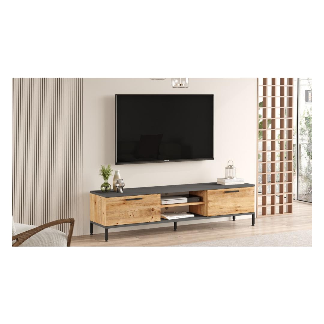 Tänu oma elegantsele ja modernsele disainile tõstab meie telerikapp koheselt teie elutoa väljanägemist. Atlandi männi ja antratsiidi värvide kombinatsioon lisab igale sisustusele elegantsi ja elegantsi. Olenemata sellest, kas teil on kaasaegne või traditsiooniline stiil, see seade sulandub sujuvalt teie ruumi üldesse esteetikasse ja parandab seda.