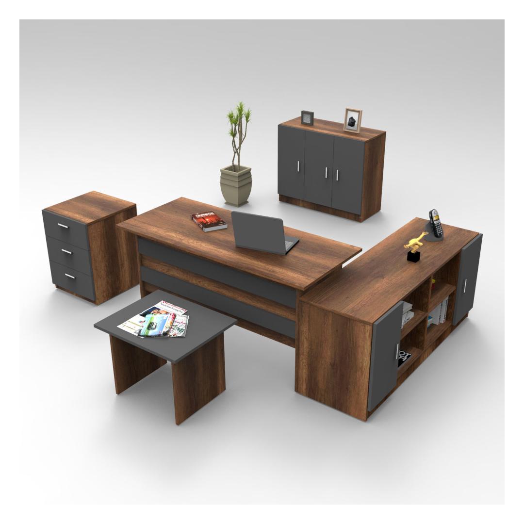 Kontorimööblikomplekti kuuluvad ruumikas töölaud, mugav kohvilaud, praktiline sahtlisahtel, mitmekülgne mitmeotstarbeline kapp ja elegantne konsool. Nende hädavajalike esemete abil saate luua produktiivse ja mugava töökoha, mis suurendab teie tõhusust ja loovust.