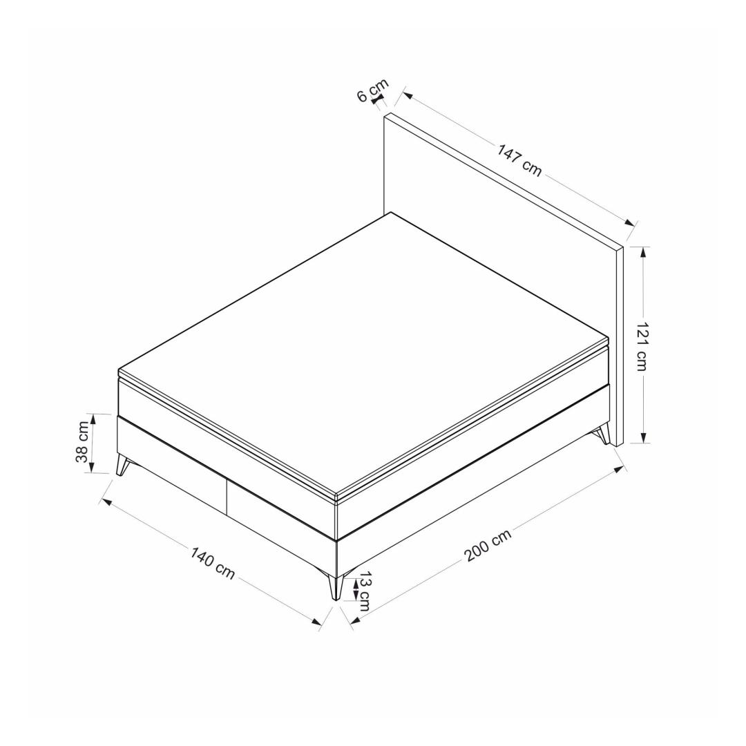 • Voodi aluse mõõtmed: Laius: 140 cm, Kõrgus: 38 cm, Sügavus: 200 cm, Jala kõrgus: 13 cm