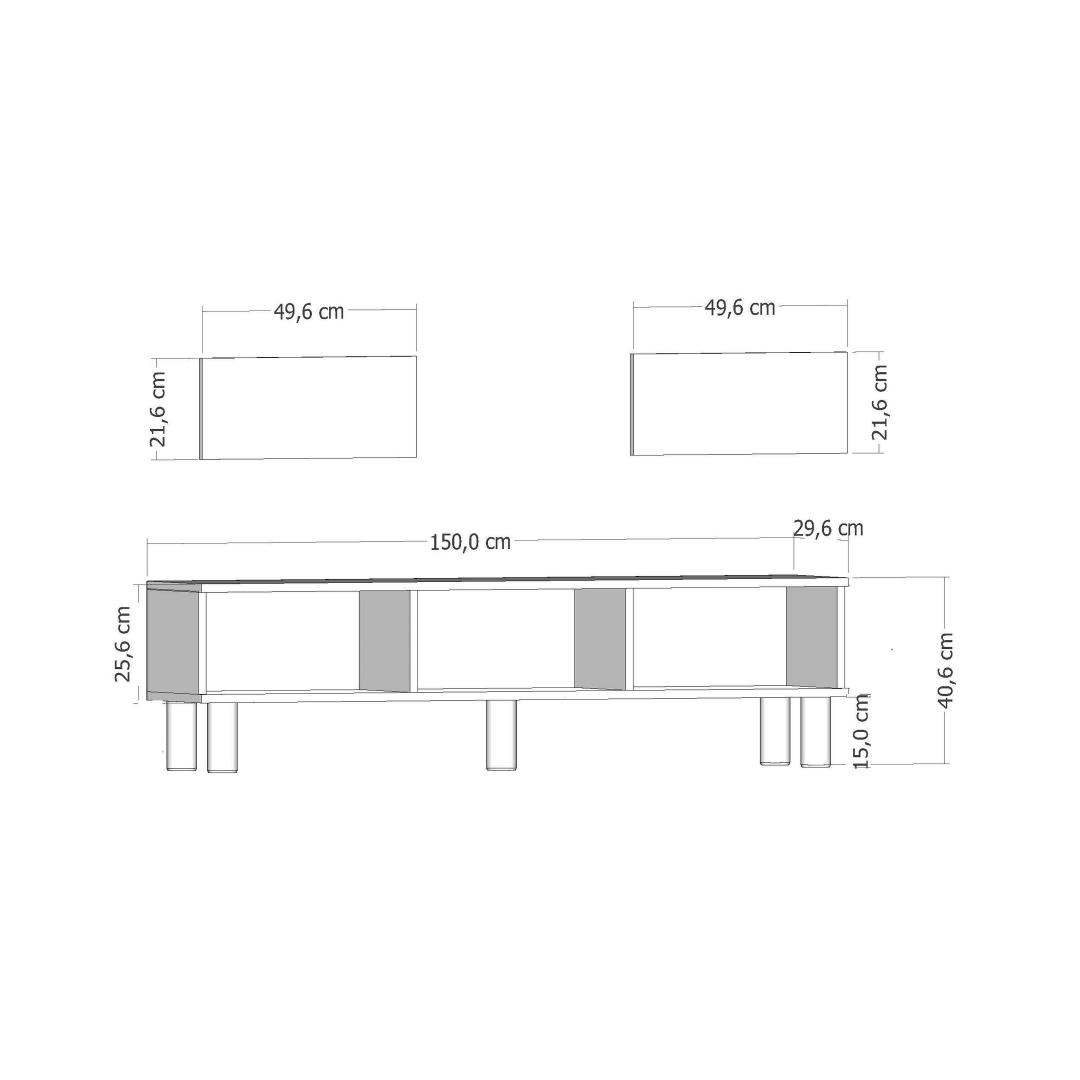 150 cm laiuse, 44,6 cm kõrguse ja 29,6 cm sügavusega, pakub see TV-alus piisavalt ruumi sinu televiisori, meedia mängijate ja dekoratsioonide jaoks. 15 cm jalakõrgus lisab veidi rafineeritust, samas kui võimalus see seina kinnitada tagab stabiilsuse ja ohutuse.