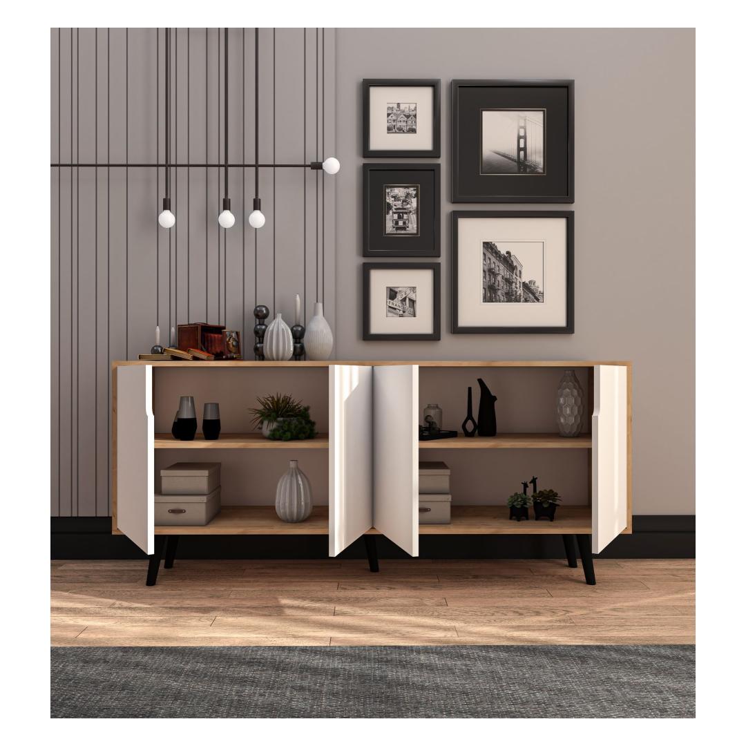 Konsoolil on kaasaegne disain, millel on puhtad jooned ja rafineeritud värvikombinatsioon Safiir Tamme ja Valge vahel. Selle avar laius 180 cm, kõrgus 80 cm ja sügavus 45 cm teeb sellest ideaalse lisandi sinu elutuppa, esikusse või magamistuppa. Rohked riiulid pakuvad piisavalt ruumi, et eksponeerida oma lemmik dekoratiivesemeid või hoida oma asju.