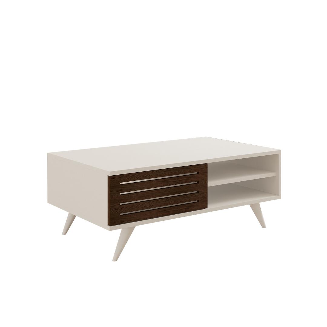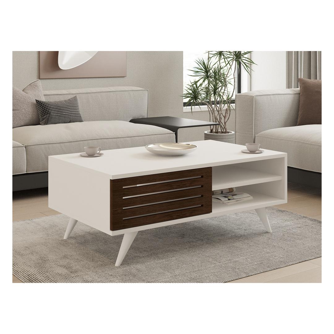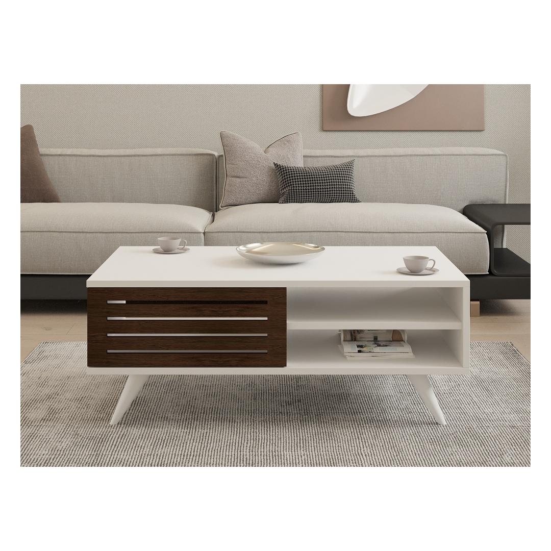 See ülima täpsusega valmistatud kohvilaud on valmistatud täispuidust uksest ja 30 mm paksust 100% melamiiniga kaetud puitlaastplaadist konstruktsioonist. Pähklipuu ja valge värvi peen kombinatsioon lisab igasse ruumi rafineeritust, sulandudes vaevata mis tahes olemasoleva sisustusega.