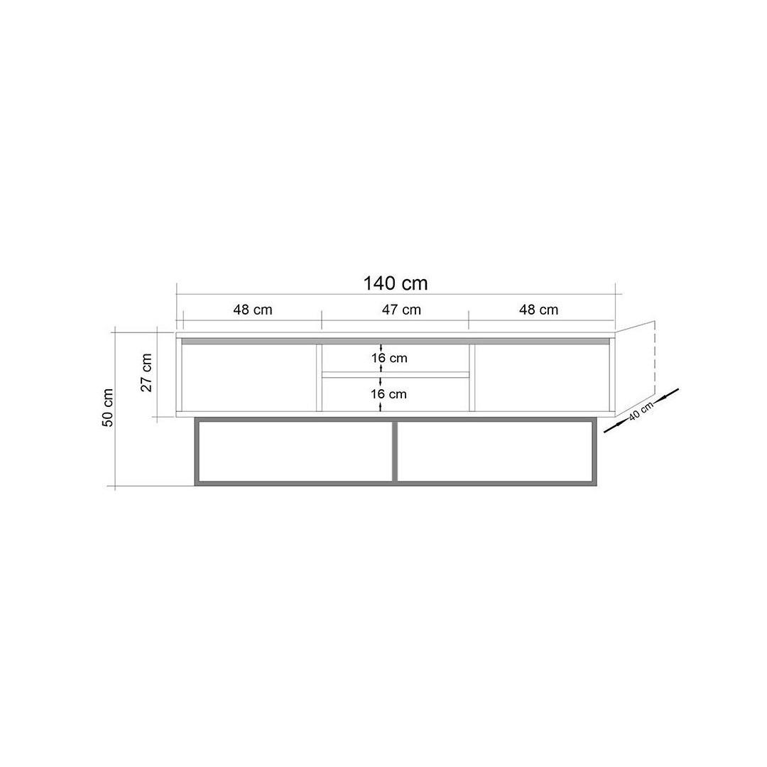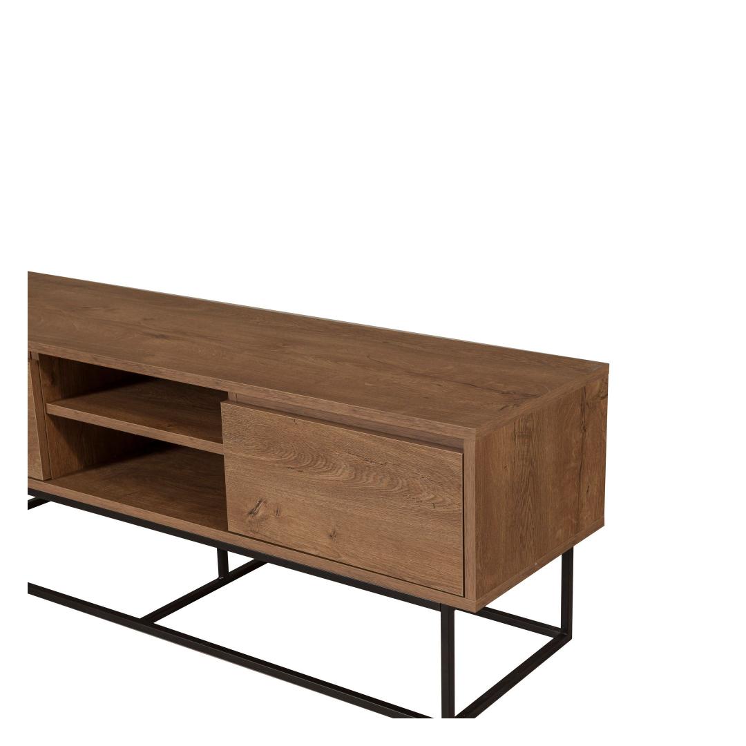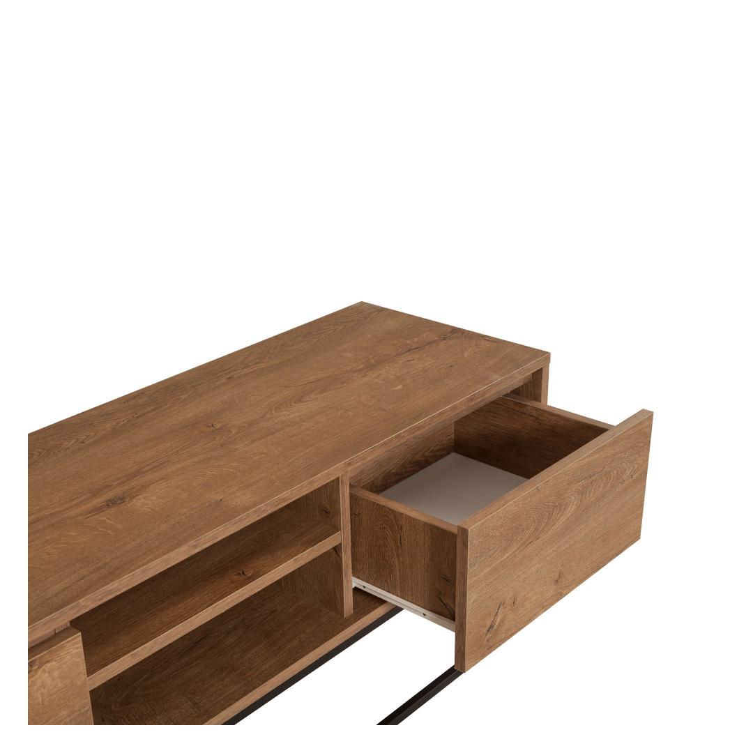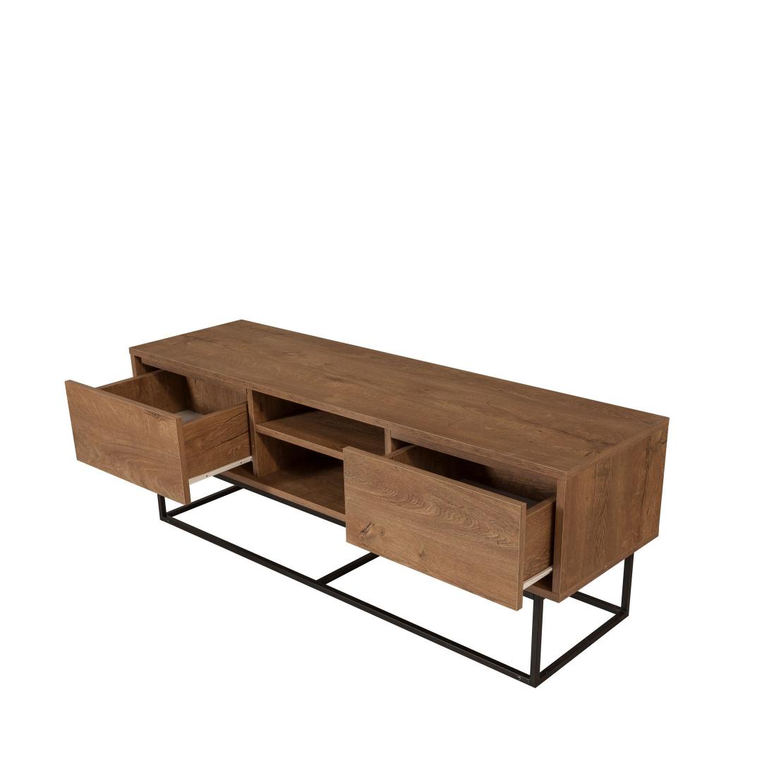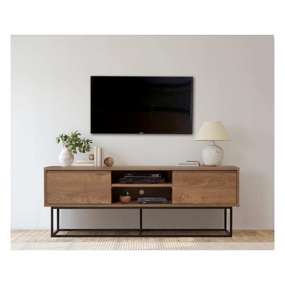 Selle voolujoonelise disaini ja piisava hoiuruumiga on see telerialus ideaalne lahendus kõigi sinu meelelahutuse vajaduste jaoks. 100% melamiinkattega puitlaastplaat tagab vastupidavuse ja pikaealisuse, samas kui metallraam lisab tööstuslikku võlu.
