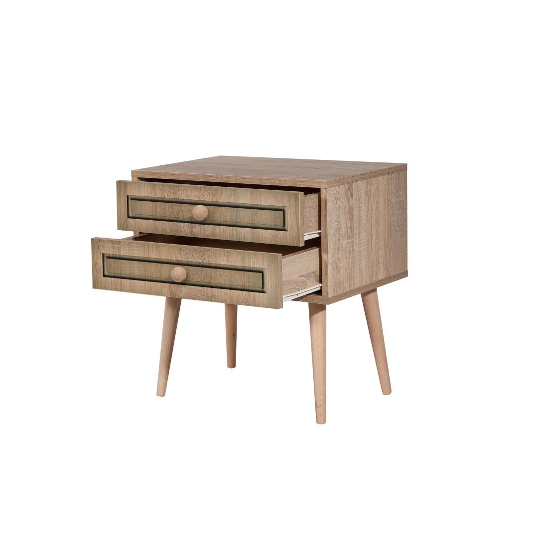 Valmistatud 100% melamiiniga kaetud puitlaastplaadist, on meie öökapp valmistatud kestma. 18 mm paksus tagab tugevuse ja stabiilsuse, samas kui sarvepuust jalad pakuvad täiendavat tuge. Metallist ja köiega käepidemetega öökapist õhkub ainulaadset võlu, mis tõstab koheselt teie toa esteetikat.