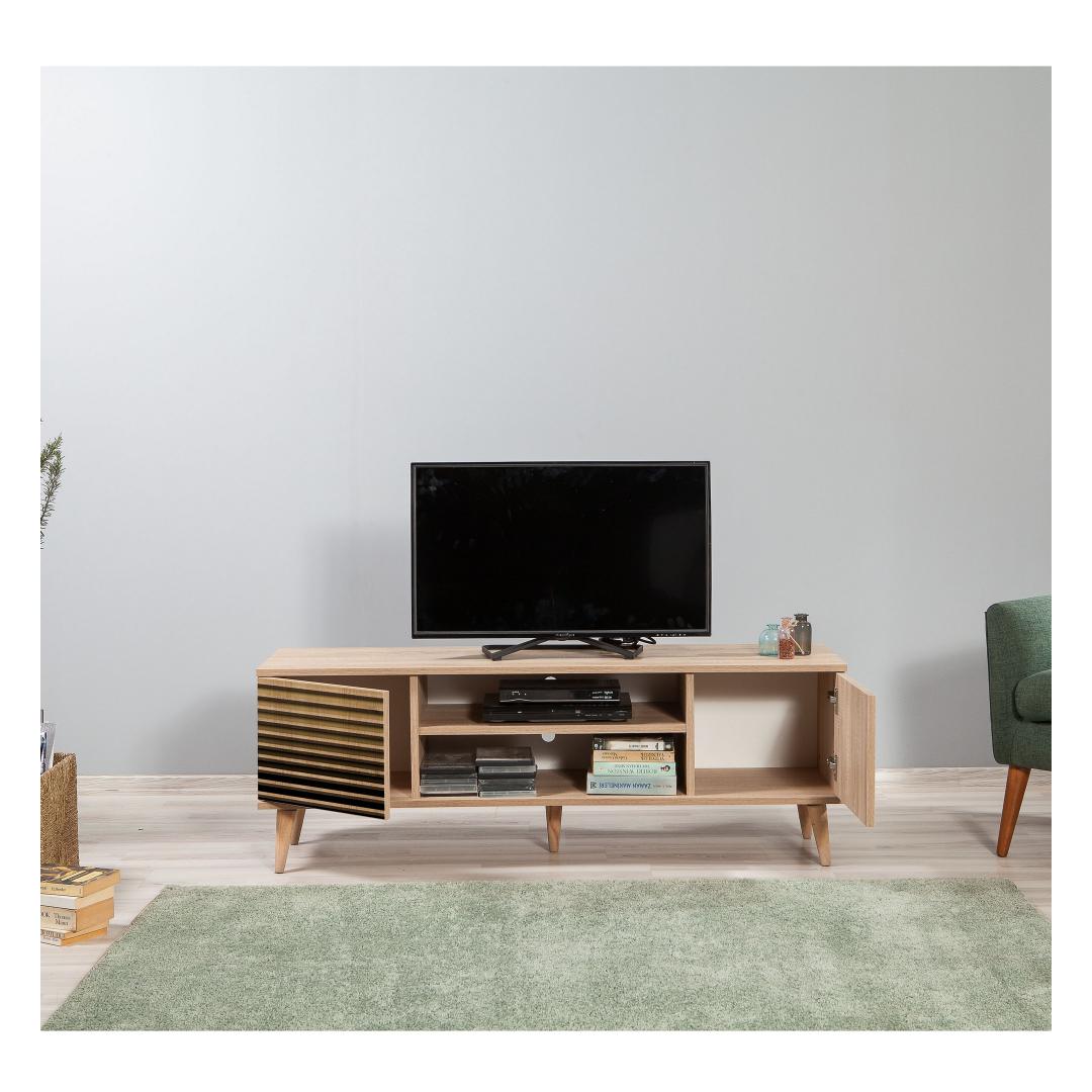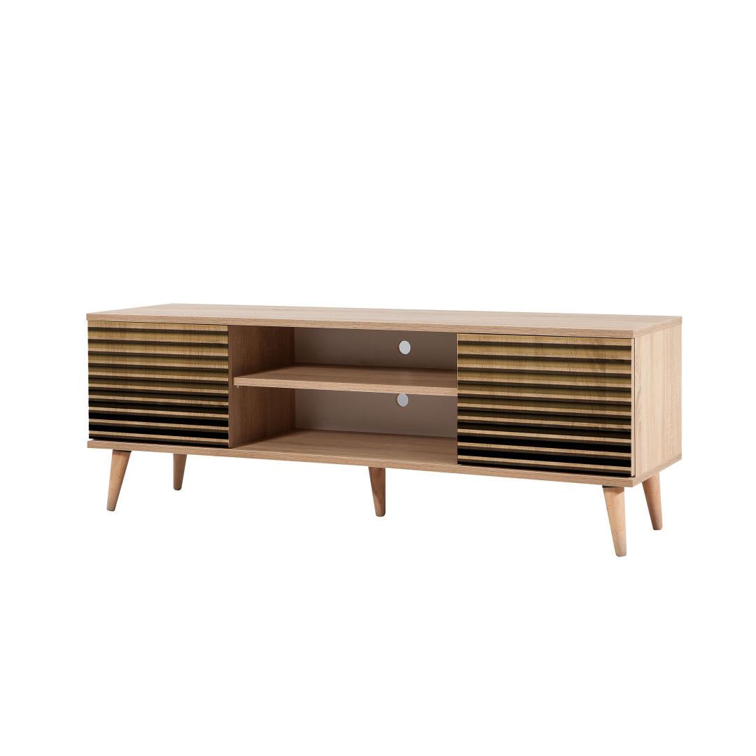 Inspireerituna kubismi ja sürrealismi kunstiliikumistest, on meie telerialus kaunistatud uimastava triibulise disainiga. Sonoma tamme värv lisab teie tuppa soojust ja võlu, luues visuaalselt silmatorkava fookuspunkti, mis jätab teie külalised imestama.