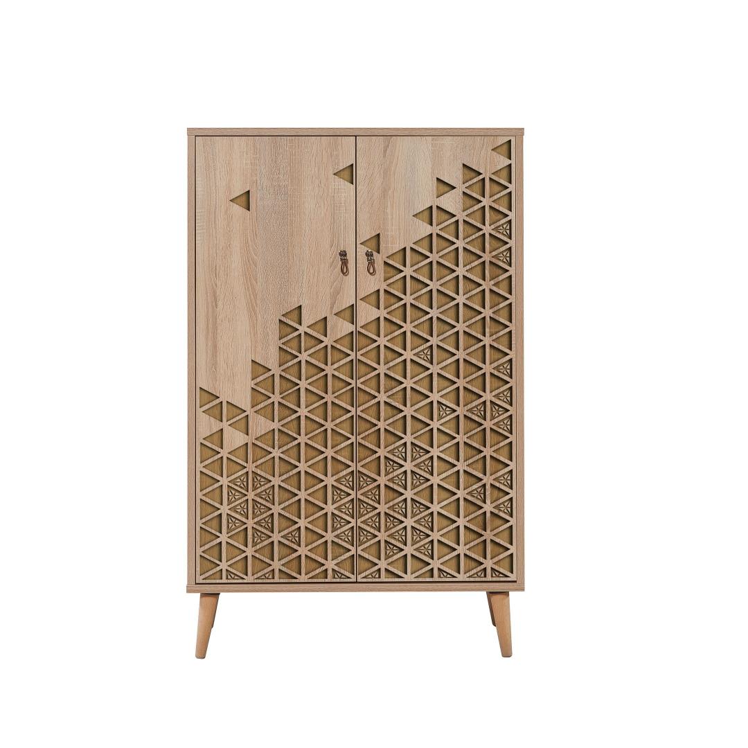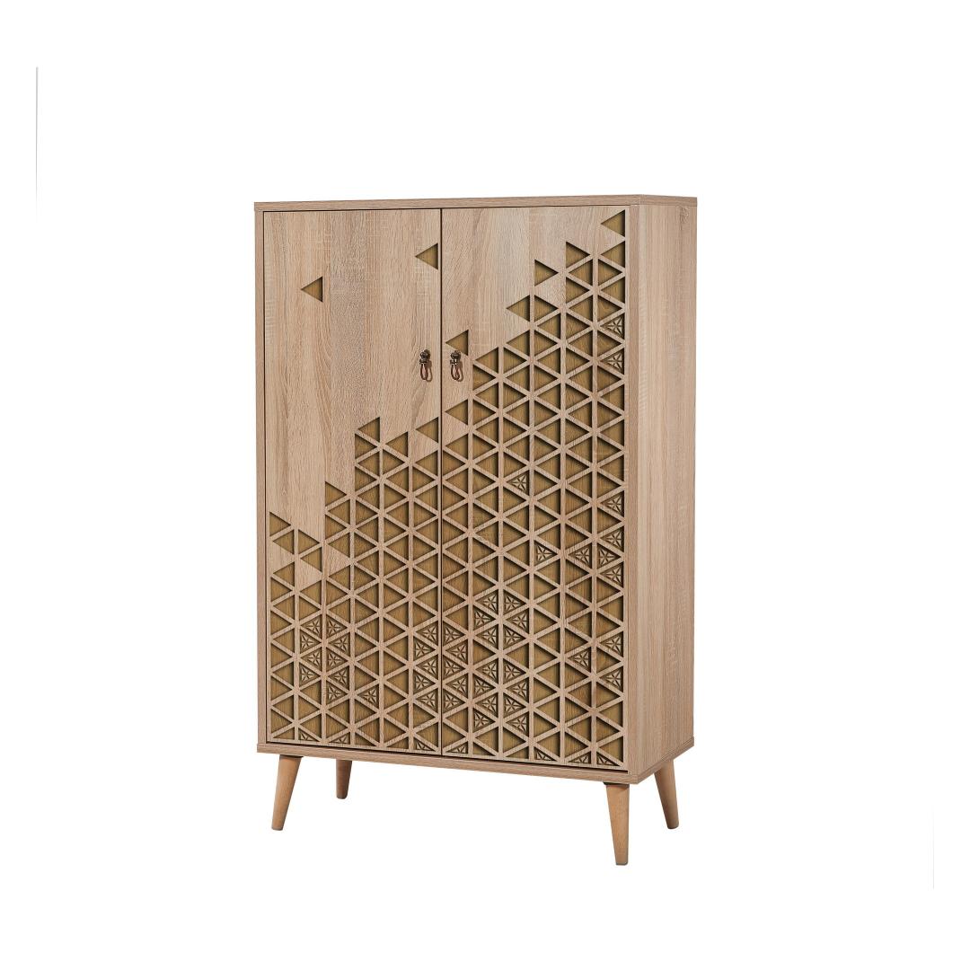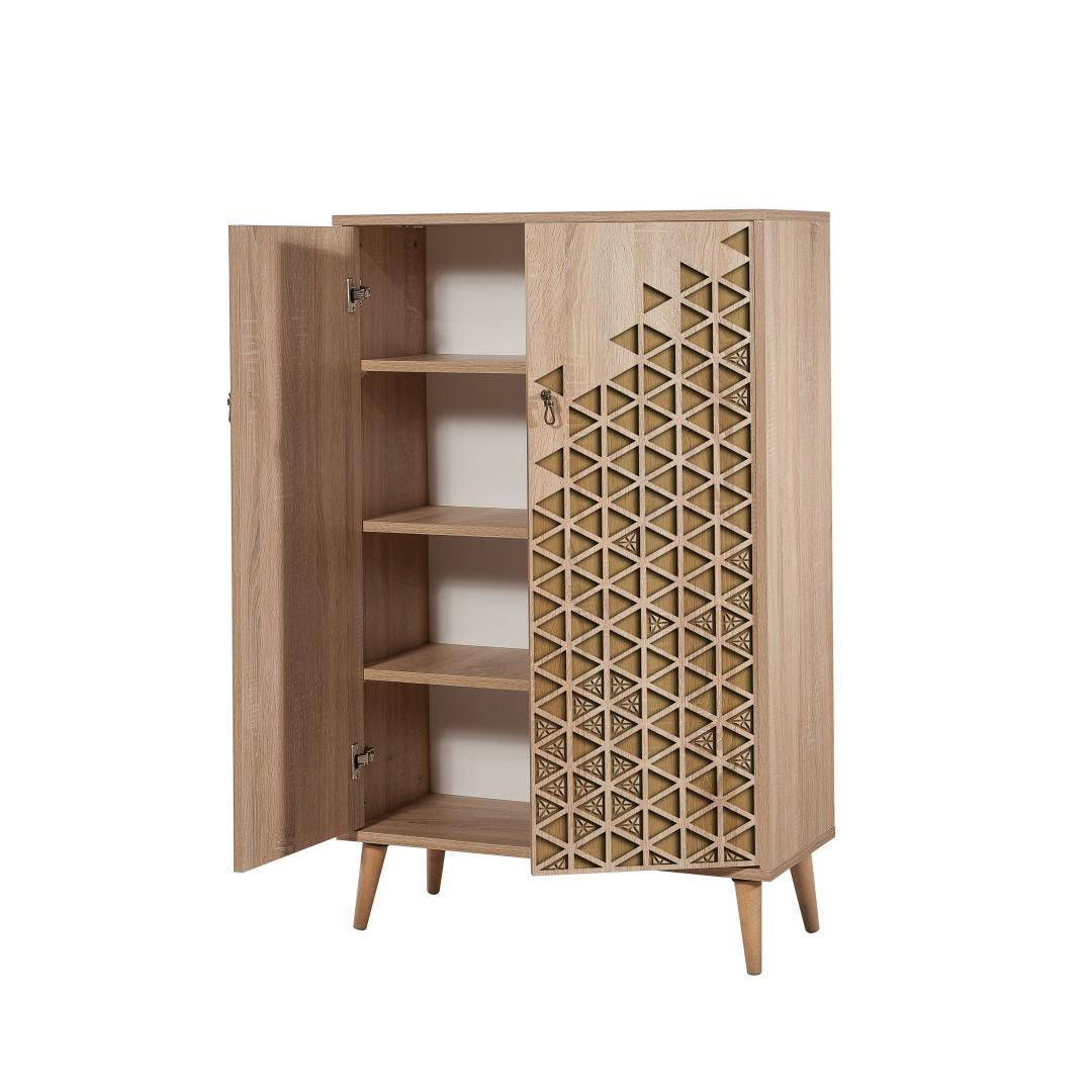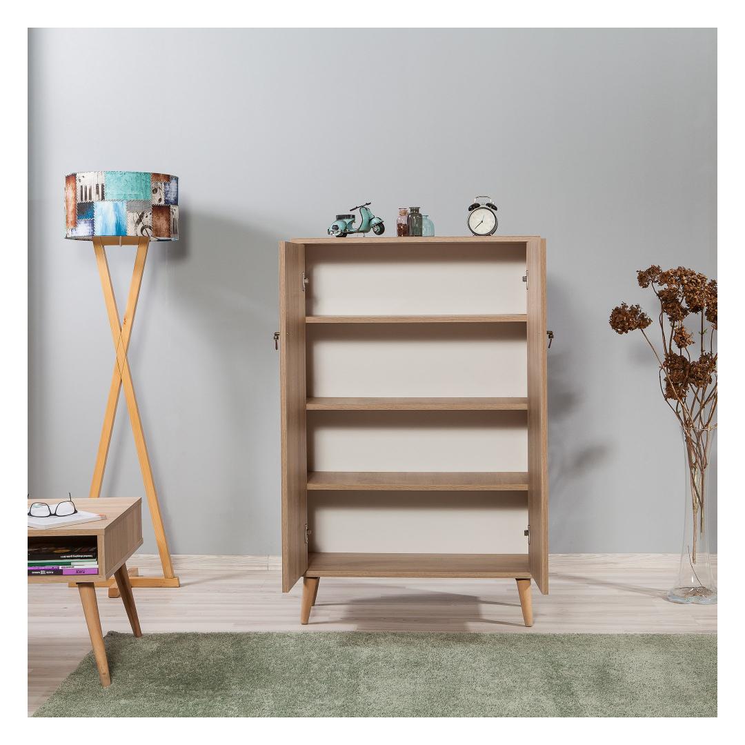 100% melamiiniga kaetud puitlaastplaadist valmistatud kapi on valmistatud kestma. Paksus 18 mm tagab tugevuse ja stabiilsuse, samas kui sarvepuust jalad pakuvad täiendavat tuge. Metallist ja köiega käepidemed lisavad elegantsi, muutes selle silmapaistvaks esemeks igas keskkonnas.