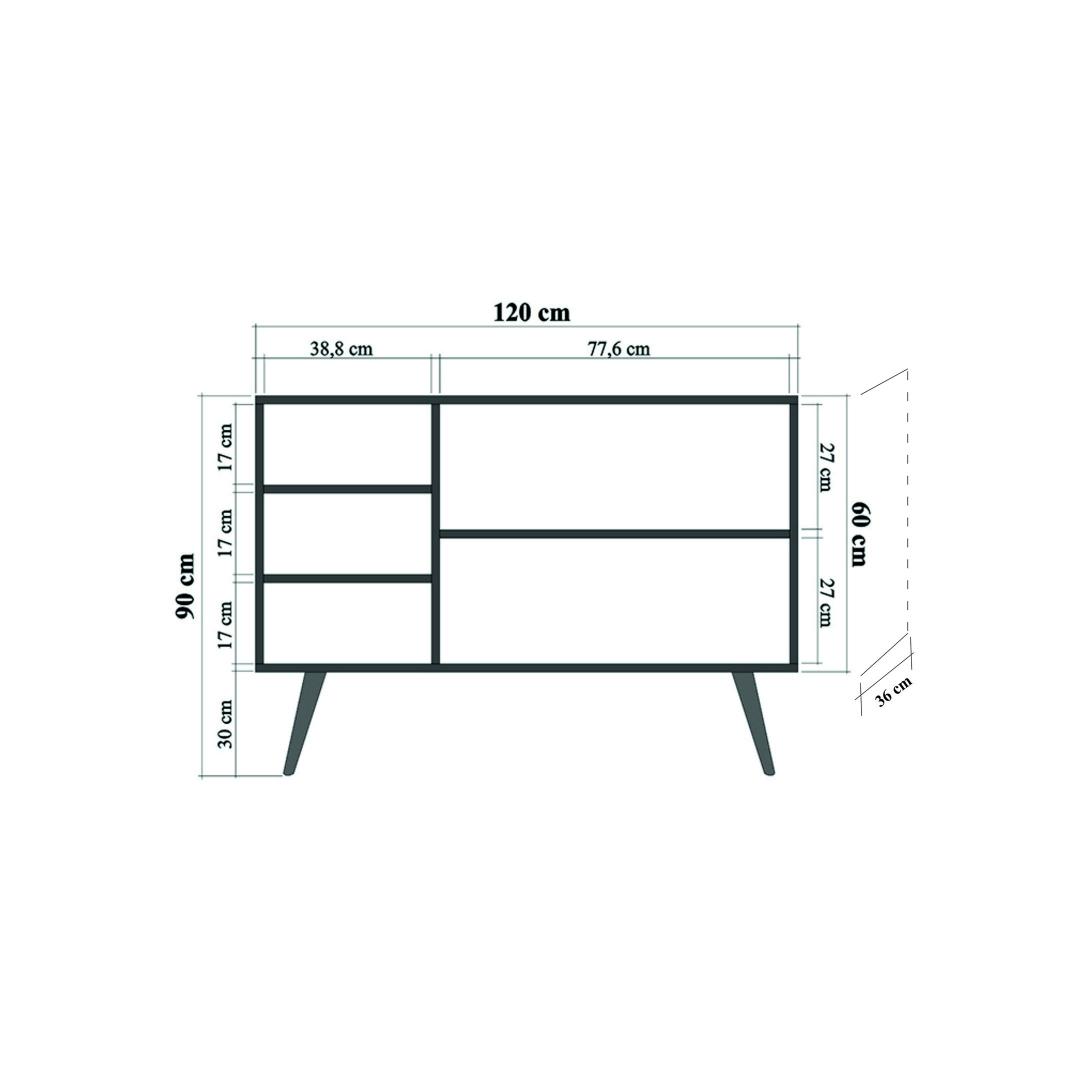 See 120 cm laiune ja arvukate riiulitega konsool pakub piisavalt hoiuruumi, et hoida oma asjad korrastatult ja käeulatuses. Parema riiuli pikkus on 77. 6 cm lai ja 27 cm kõrge, vasaku riiuli pikkus on 38 cm. 8 cm lai ja 17 cm kõrge.