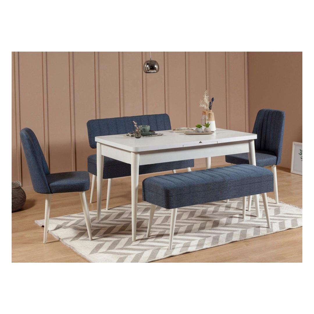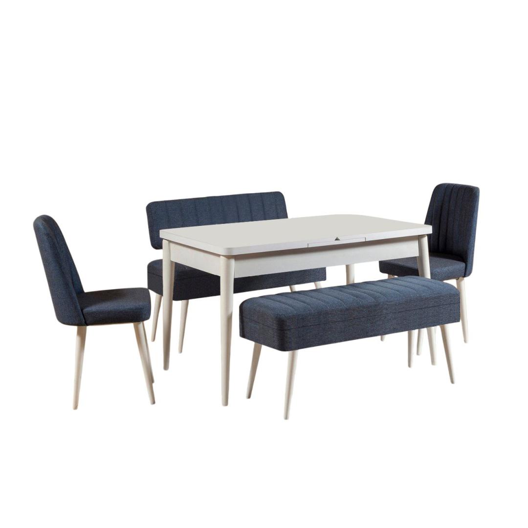 Söögilaud on elegantse disainiga, mille laius on 129 cm, kõrgus 75 cm ja sügavus 80 cm. Laiendatud kujul laieneb see 163 cm laiuseks, pakkudes piisavalt ruumi perekondlikeks koosviibimisteks ja õhtusöögi pidudeks. Kaasasolevad toolid, mille mõõtmed on 47 cm (laius), 90 cm (kõrgus) ja 45 cm (sügavus), pakuvad nii mugavust kui ka stiili. Komplekti kuuluvad ka pink ja pank, mis lisavad teie söögisaali mitmekülgsust ja unikaalsust.