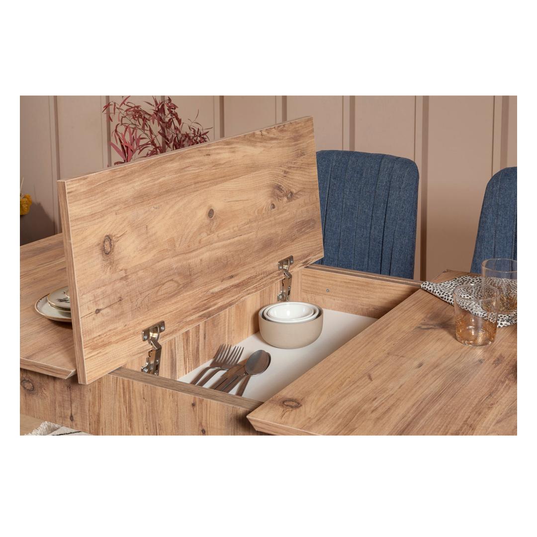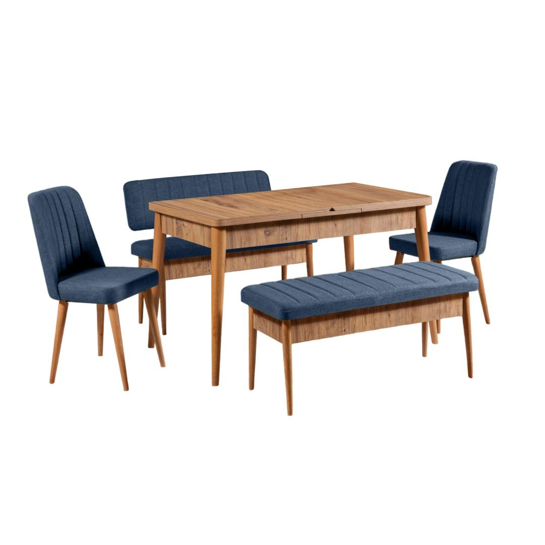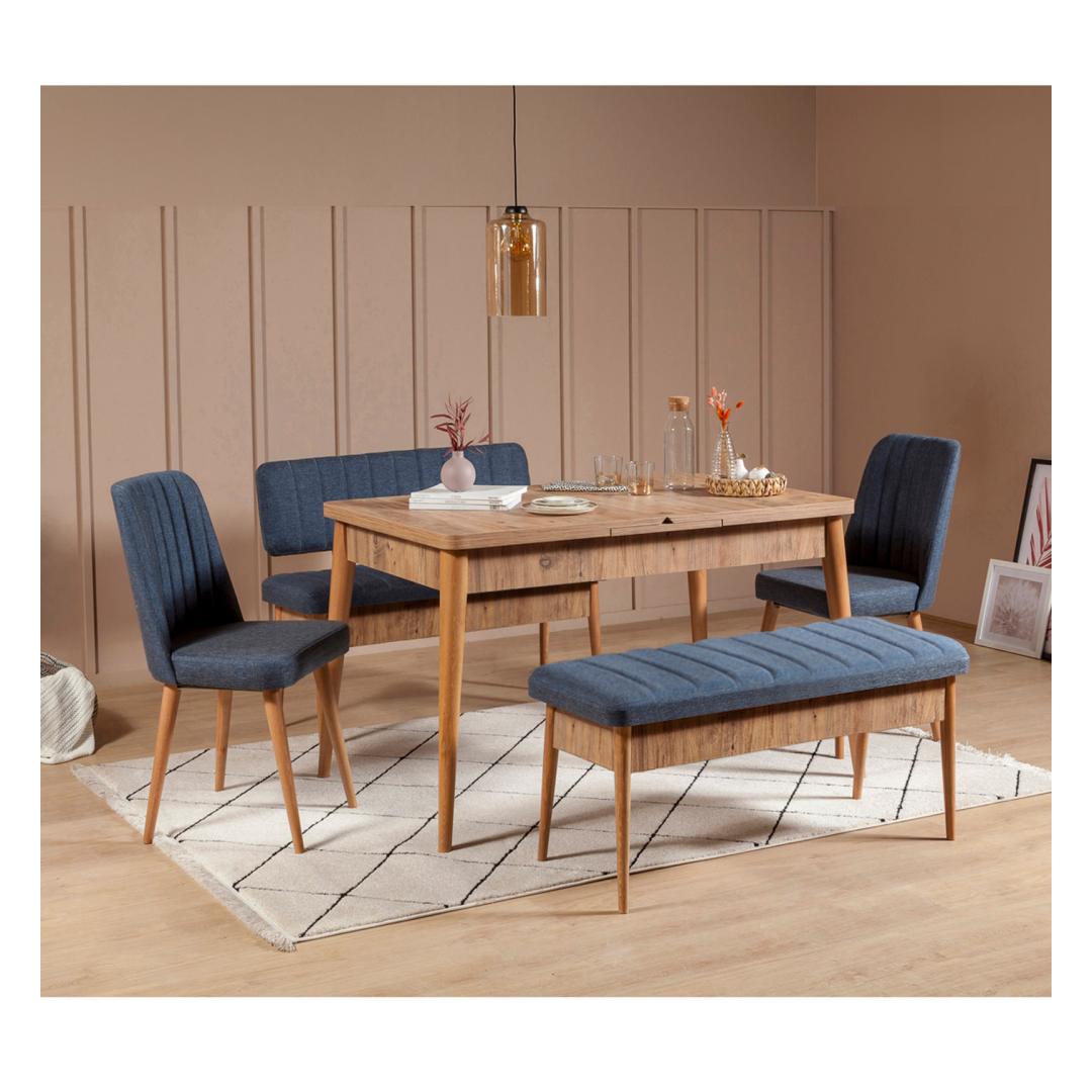 Söögilaud uhkeldab voolujoonelise disainiga, mille laius on 130 cm, kõrgus 77 cm ja sügavus 80 cm. Pikendatuna ulatub see laiuseks 165 cm, mis on ideaalne õhtusöökide või peresündmuste korraldamiseks. Toolid ja pink pakuvad mugavat istumist modernse puudutusega, samas kui hoiukapp lisab teie ruumile funktsionaalsust.