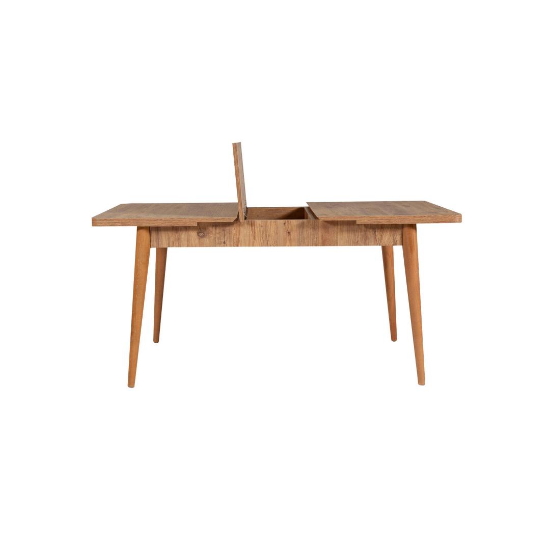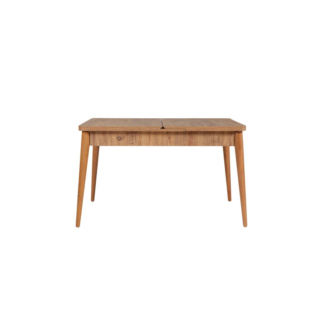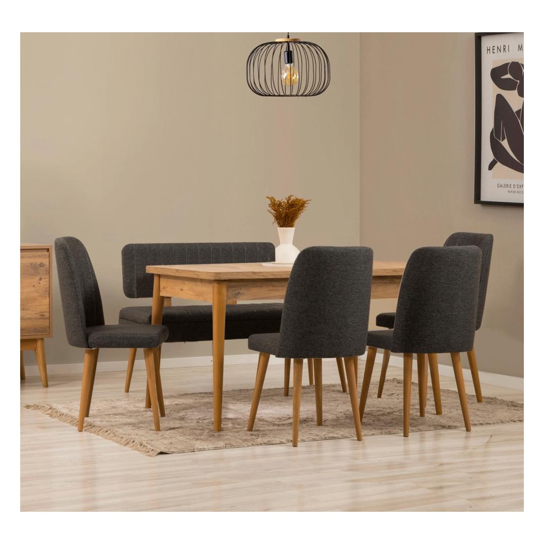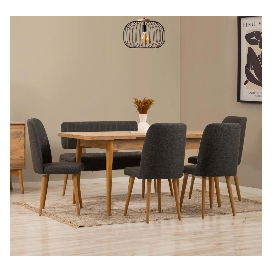 Muuda oma söögituba stiilseks ja funktsionaalseks ruumiks meie pikendatava söögilaua ja toolide komplektiga. Valmistatud 100% melamiinkattega puitlaastplaadist, on see komplekt mitte ainult vastupidav, vaid ka lihtne puhastada, muutes selle ideaalseks igapäevaseks kasutamiseks. Elegantne sarapuu jalad lisavad disainile peenust, samas kui toolide 100% linane kangas tagab mugavuse pikka aega pereliikmete ja sõpradega söömisel.