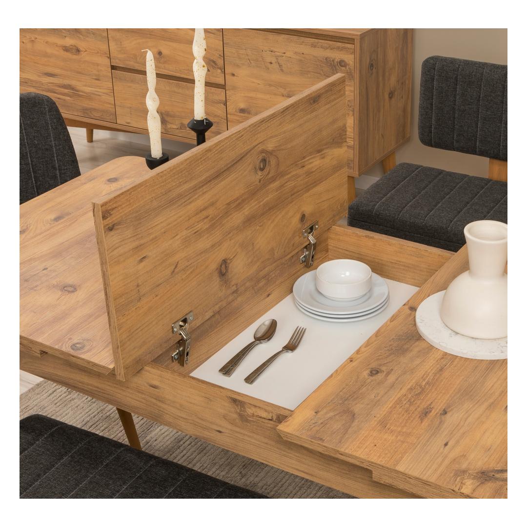 Söögilaud on viimistletud stiilse Atlandi mändi värviga, mis sobib igasse sisustusse, samas kui toolide antratsiidi värv lisab komplektile modernset puudutust. Laua pikendatav funktsioon võimaldab teil vajadusel hõlpsasti rohkem külalisi mahutada, muutes selle ideaalseks nii väikestele kui ka suurtele koosolekutele. Komplekti kuulub ka pink ja hoiukapp, mis pakuvad lisamugavust ja mitmekesisust.