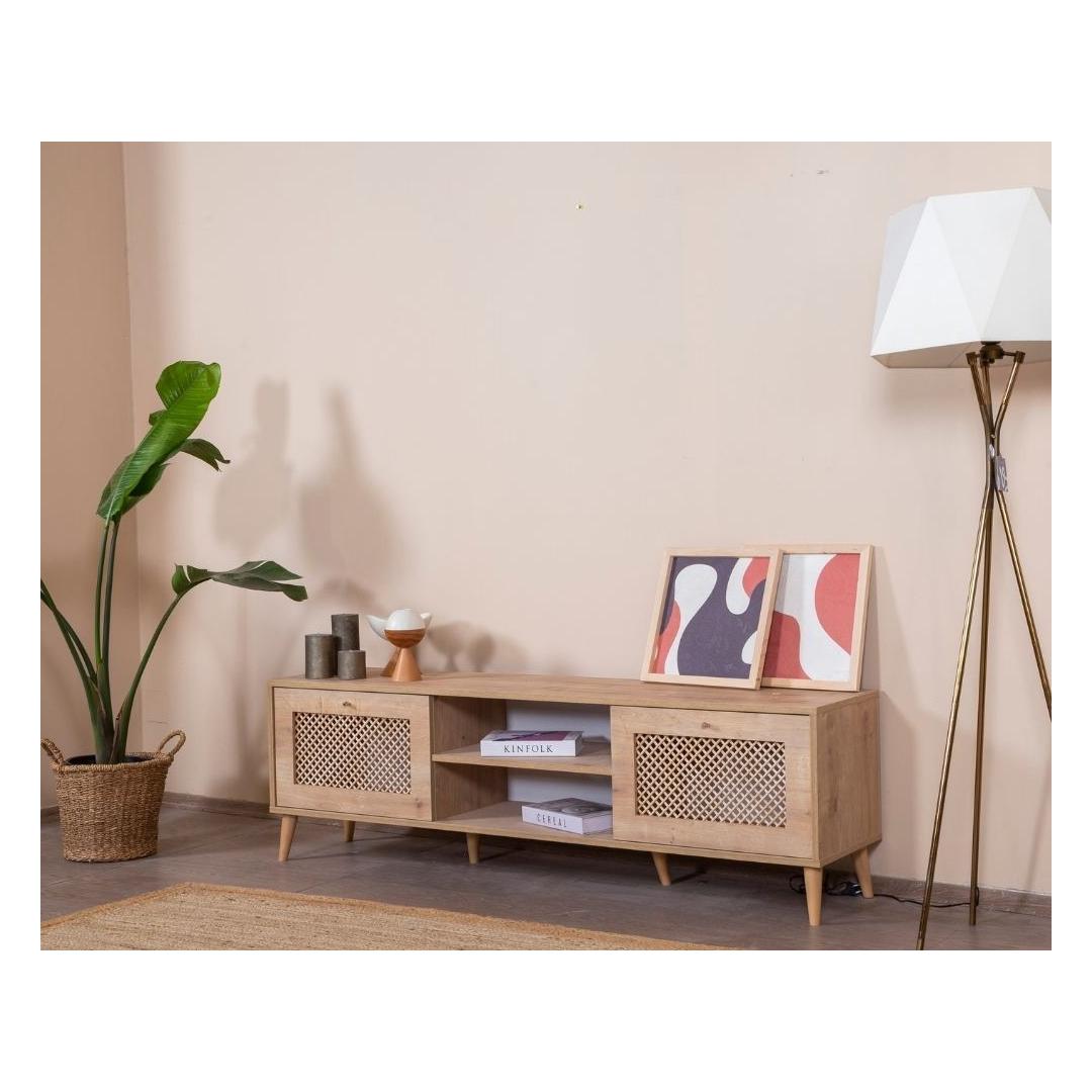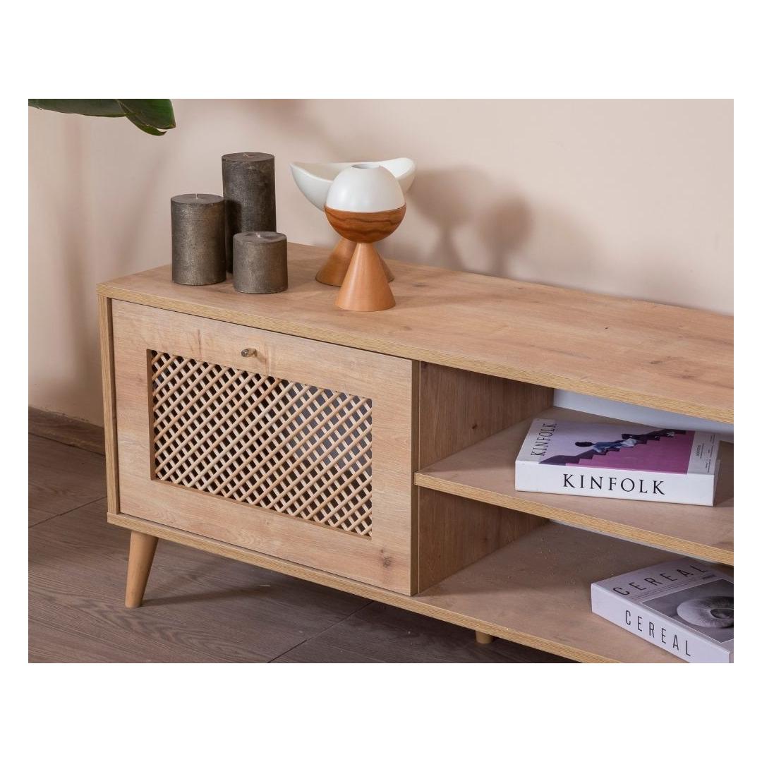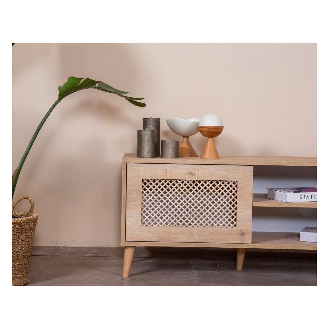 Tamme TV-alus omab sujuvat ja modernset disaini, mis täiendab vaevata igasugust sisustust. Selle tugev pruun värv ja geomeetrilised detailid lisavad sinu elutuppa natuke Skandinaavia võlu, luues sooja ja kutsuva atmosfääri, millest saavad osa nii sina kui ka sinu külalised.