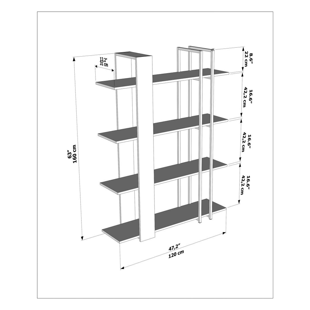 120 cm laiune, 160 cm kõrge ja 31 cm sügavune, pakub see raamatukapp piisavalt hoiuruumi kõigi teie raamatute, fotoraamide, taimede ja muude dekoratiivsete esemete jaoks. Hoidke oma ruum organiseeritud ja segaduseta selle stiilse ja funktsionaalse esemega.