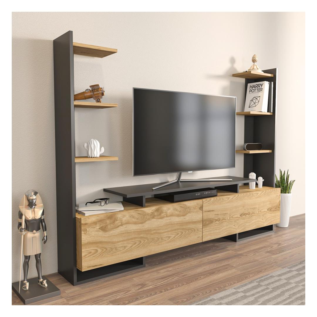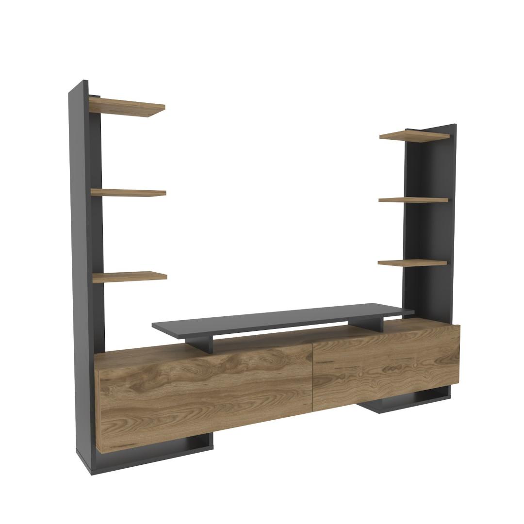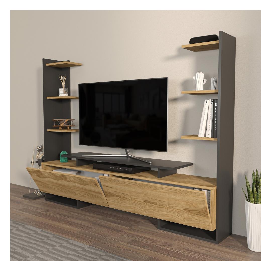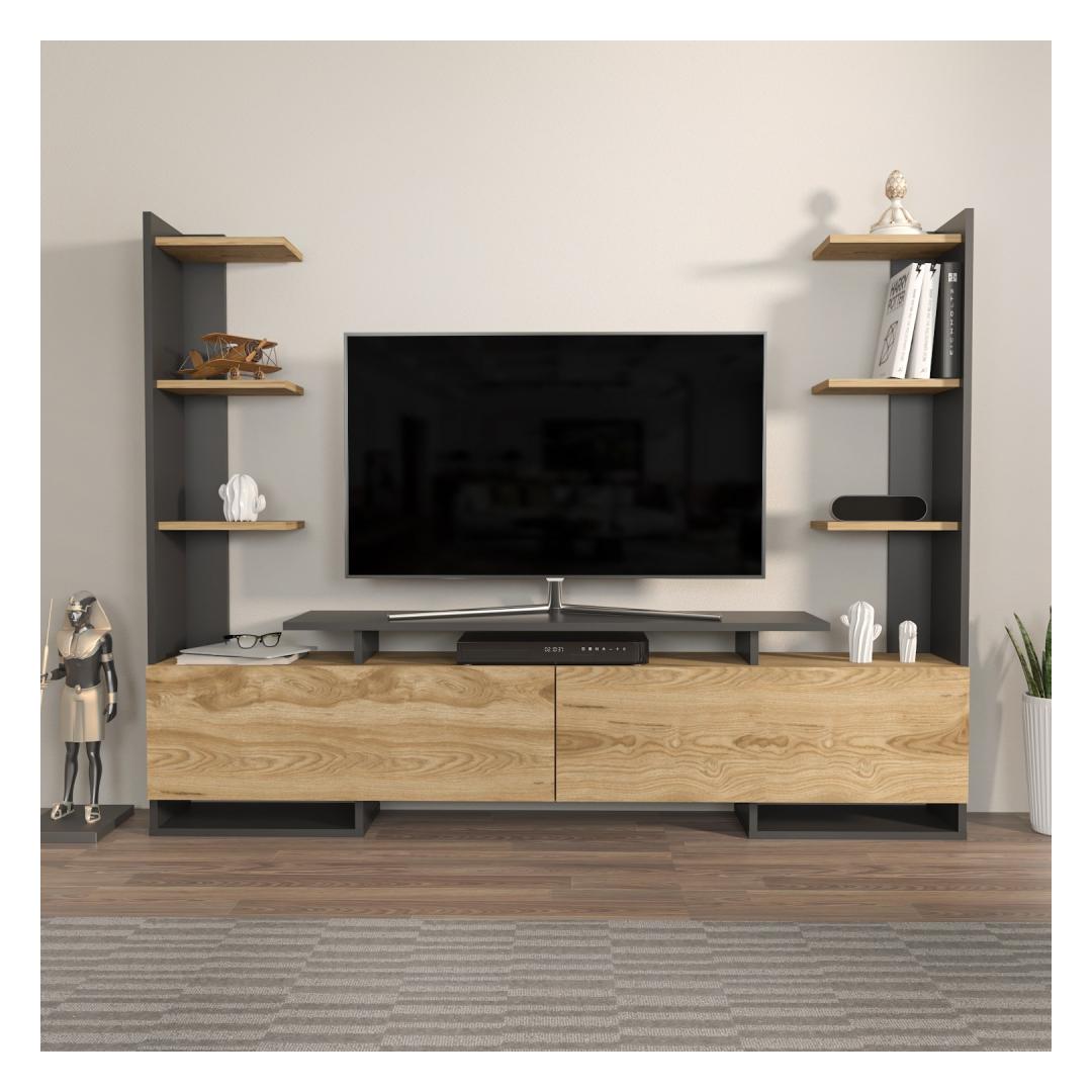 Meie televiisoristendil on piisavalt hoiuruumi, mis võimaldab teil oma meelelahutustarbeid kenasti korraldada. 18 mm paksune, 100% melamiiniga kaetud puitlaastplaat tagab vastupidavuse ja pikaealisuse, mistõttu on see usaldusväärne valik teie koju.