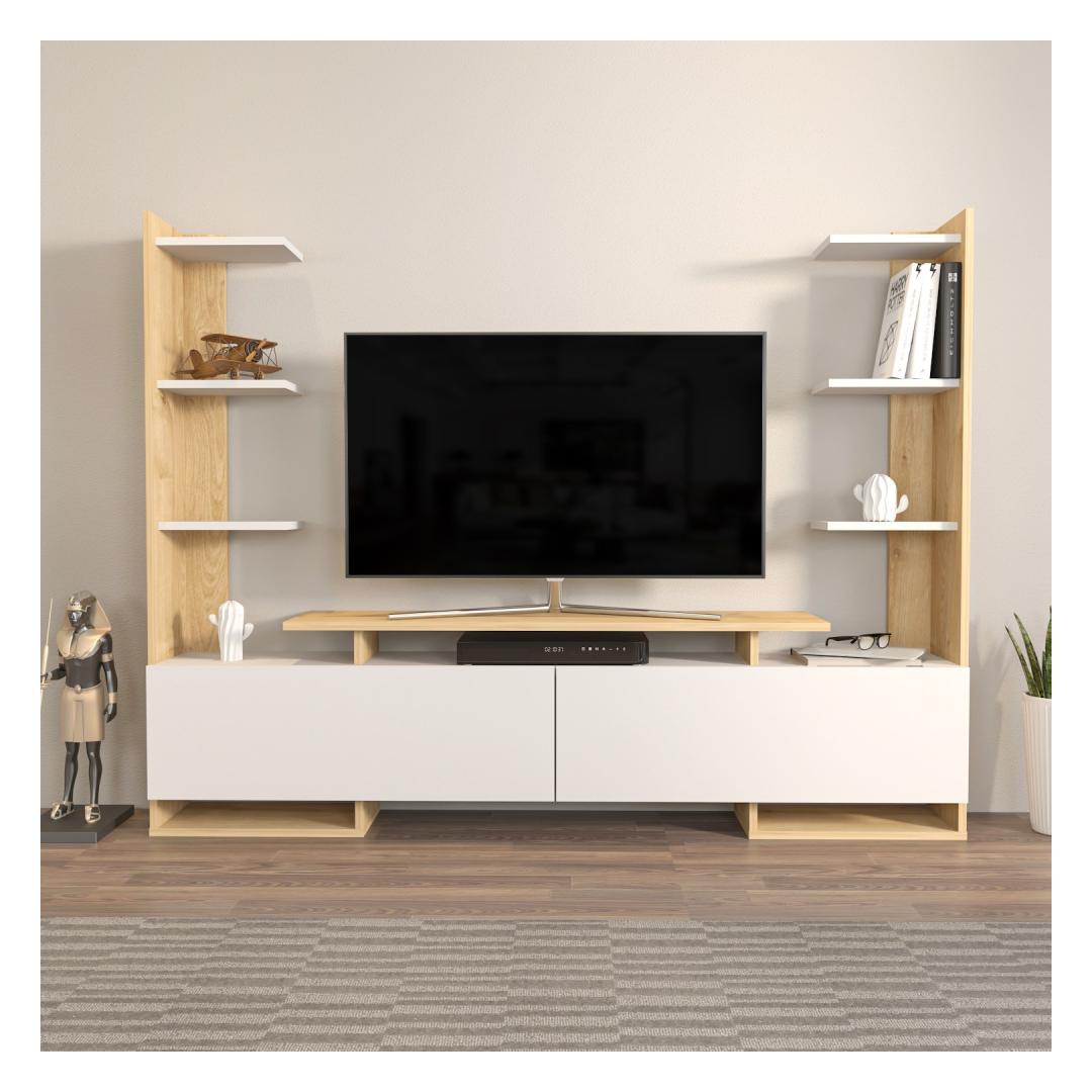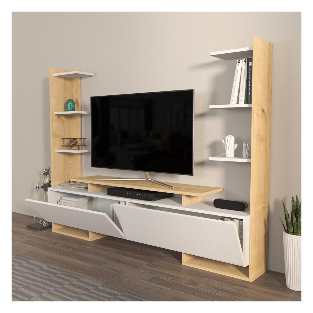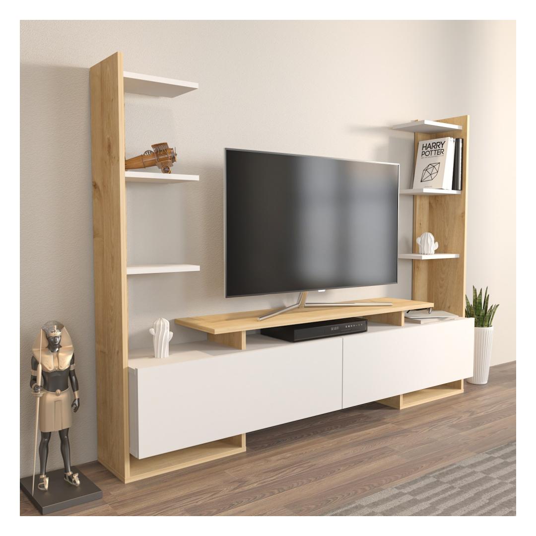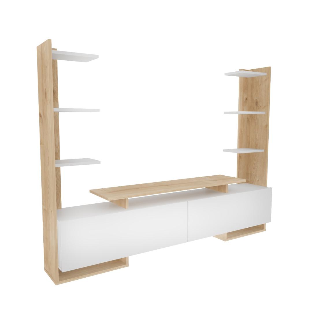 Kaunis valge ja tammevärvi kombinatsiooniga teleritugi sobib vaevata kokku mis tahes sisustusega. Kontrastsed värvid lisavad teie elutuppa elegantsi ja rafineeritust, muutes selle teie ruumi keskpunktiks. Ole valmis oma külalistele muljet avaldama oma laitmatu maitsega!