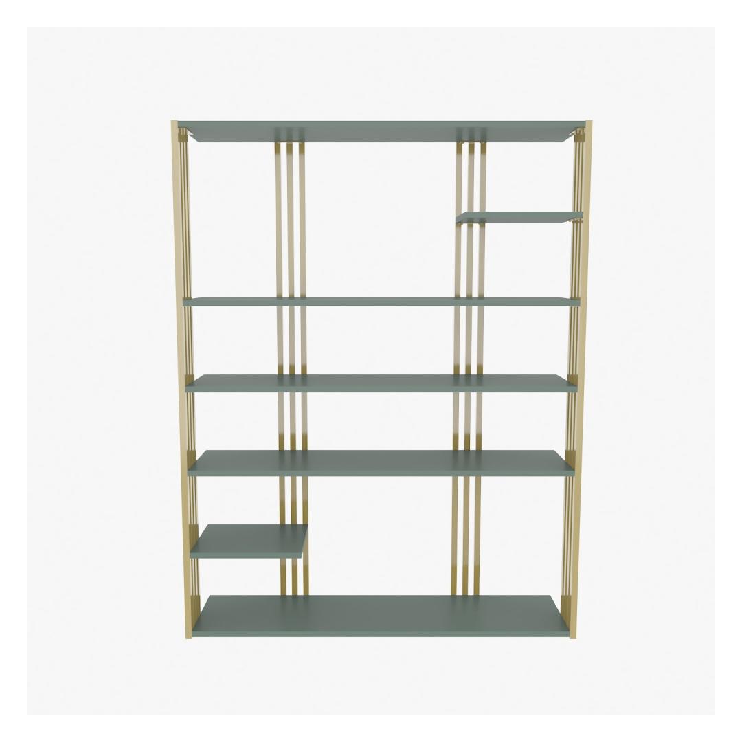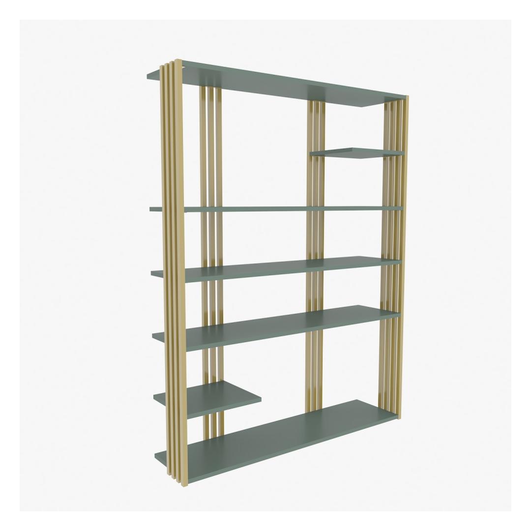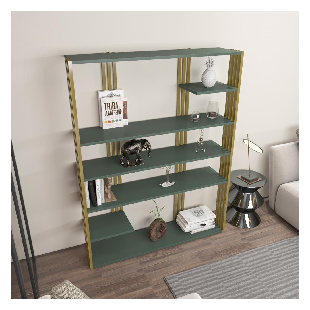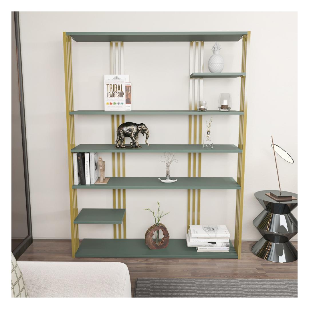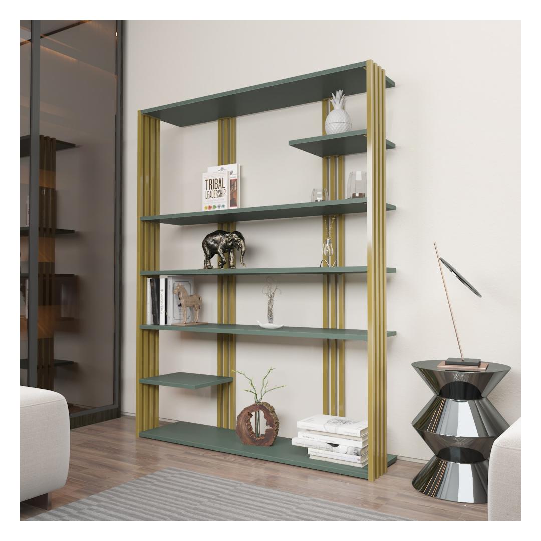 Rohelise ja kuldse värvi ainulaadse kombinatsiooniga lisab see raamaturiiul teie ruumile rafineerituse ja elegantsi. Elav roheline toon sümboliseerib kasvu, harmooniat ja tasakaalu, samal ajal kui säravad kuldsed aktsendid õhkavad luksust ja külluslikkust. Laske oma kujutlusvõimel käia, kui kujutate ette, kuidas see peeneseid esemeid teie elutuppa, tööruumi või kontorisse paigutada.