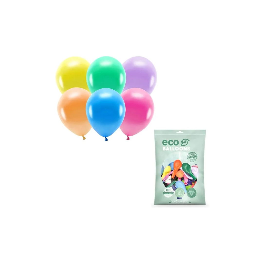 Набор экологичных воздушных шаров PartyDeco, металлизированные, разные цвета, 26 см, 100 шт. Все экологичные шары PartyDeco изготовлены из натурального латекса. Они отлично подходят для создания гирлянд или стен из шаров. Прочные латексные шары, которые можно наполнять гелием или обычным воздухом. Этот набор содержит 100 металлизированных экологичных шаров. Разные цвета: белый, желтый, красный, травянисто-зеленый, светло-голубой, синий, розовый, оранжевый, золотой, серебряный. Диаметр в надутом состоянии: 26 см.