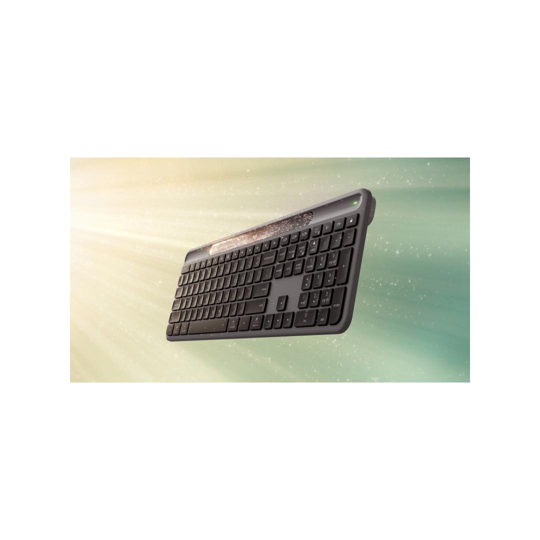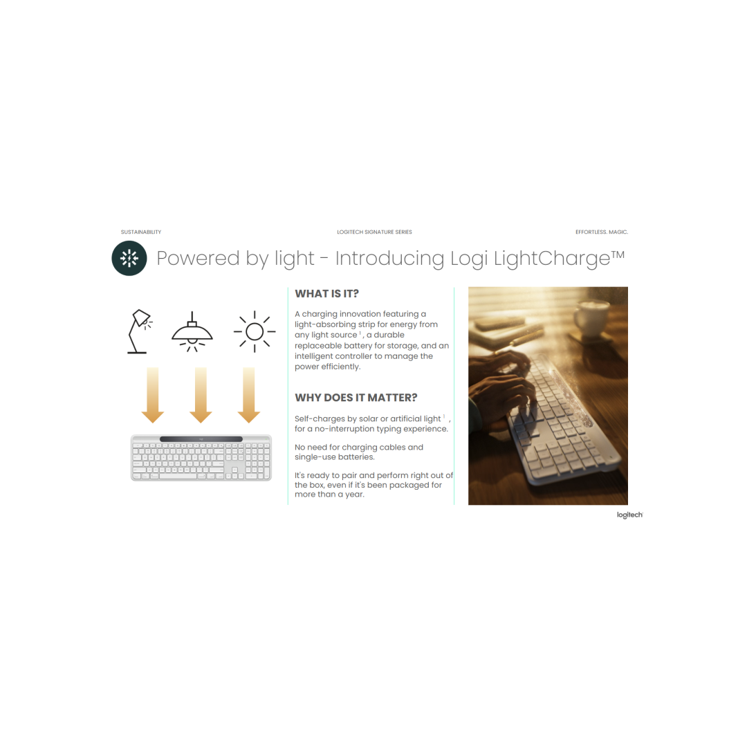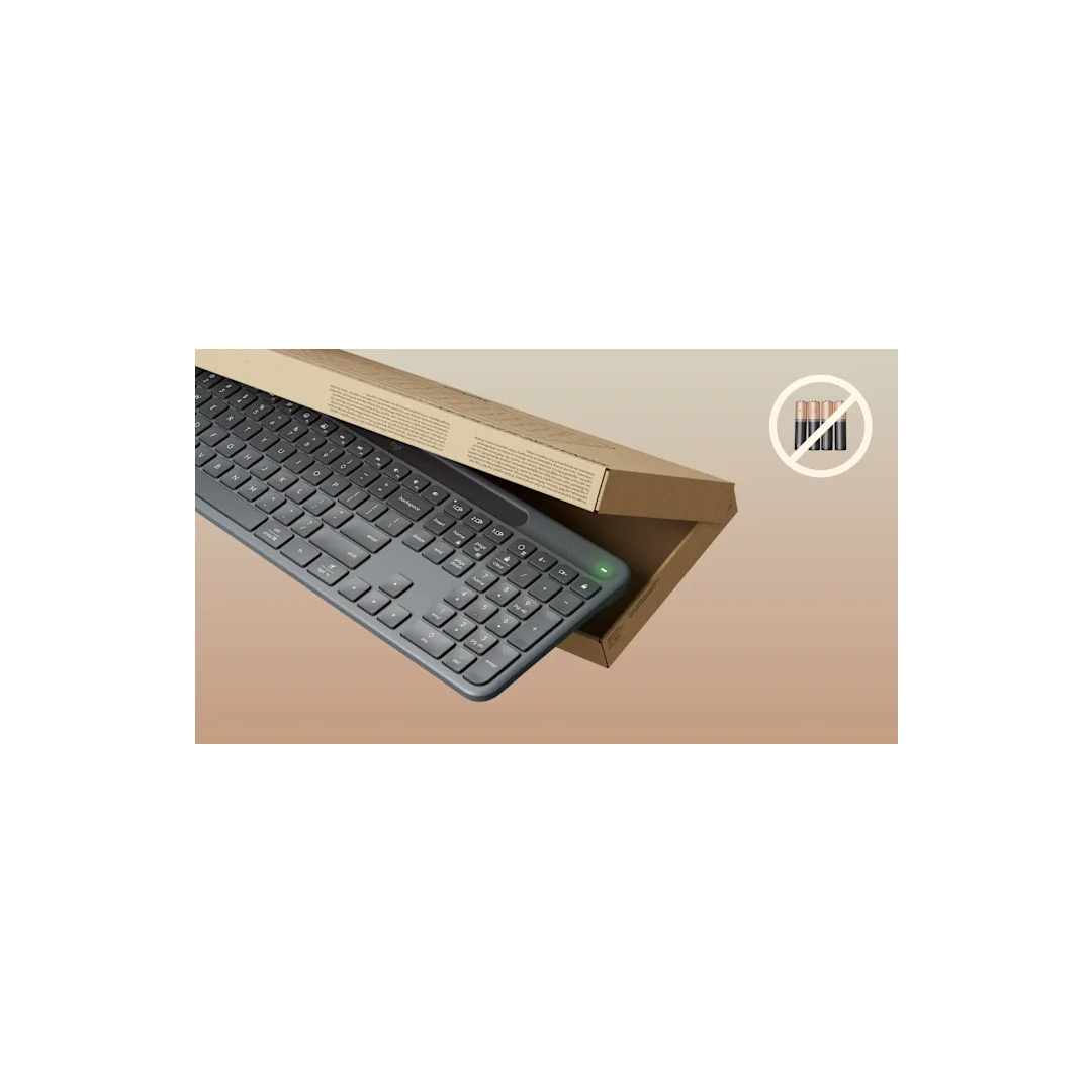4) Signature Slim Solar+ Keyboard K980 off white recycled plastic content: minimum 52%. Excludes plastic in printed wiring assembly (PWA), and packaging. Signature Slim Solar+ Keyboard K980 graphite recycled plastic content: minimum 70%. Excludes plastic in printed wiring assembly (PWA), and packaging.