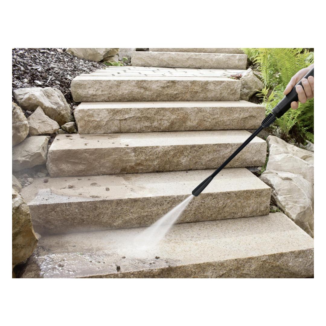Whether it's dirty vehicles, steps, garden tools or garden furniture, the K 2 Universal Edition OJ pressure washer with single spray lance will have them spick and span in a flash. The compact device is ideal for all occasional cleaning tasks around the home and yard. The flat jet on the single spray lance provided achieves targeted cleaning for contoured surfaces. Thanks to its low weight and the built-in, handy carrying handle, you can easily transport the K 2 Universal Edition OJ to where you need it. The Quick Connect system offers additional convenience as its quick coupling allows the three metre long high-pressure hose to be connected to and disconnected from the device and trigger gun easily. All of the included accessories can be easily stowed on the K 2 Universal Edition OJ. This is made possible by the clever brackets on the device. Even the power cable can be stowed away neatly in the integrated cable slot.