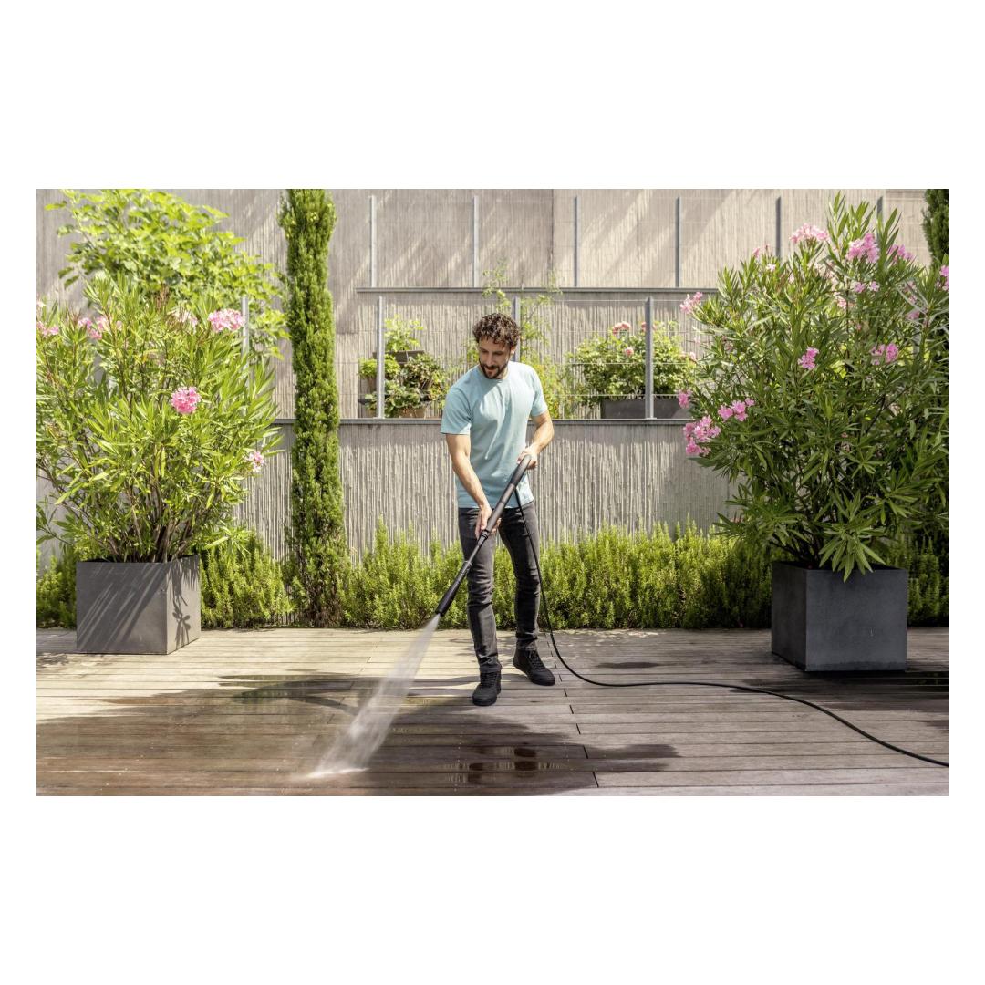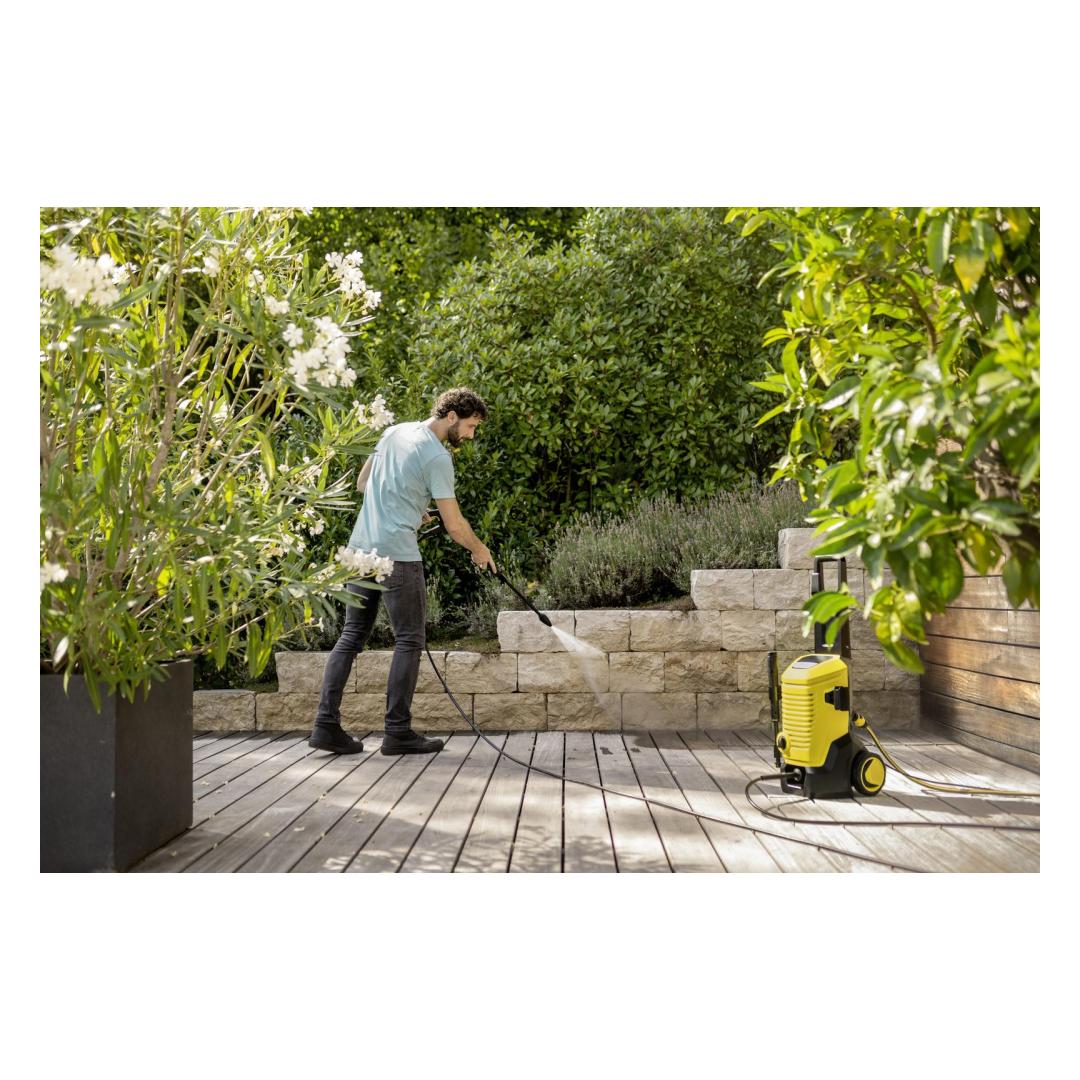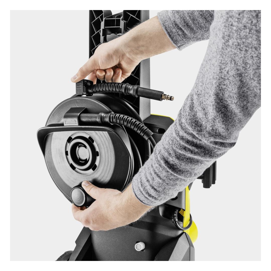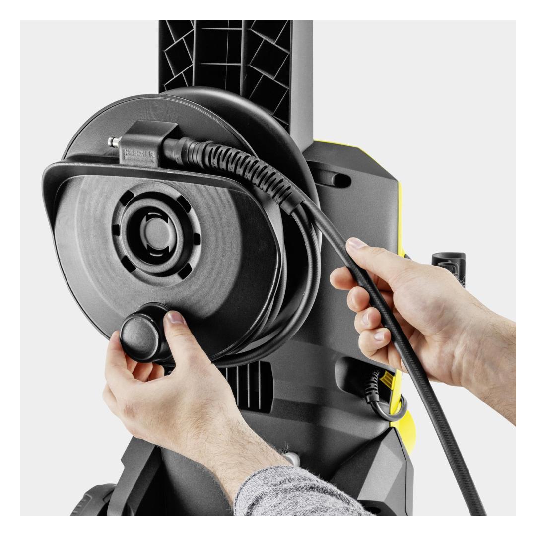 Powerful performance meets long lifetime: The K 5 WCM Premium with its powerful, water-cooled motor removes dirt in an instant. Paths, terraces and vehicles can be cleaned when required with the spray lances. The pressure can be easily adjusted on the Vario Power spray lance (VPS) simply by turning – for particularly targeted, surface-friendly cleaning. Other superb features of the dirt blaster include the rotating point jet, the integrated hose reel for practical storage directly at the device, as well as a built-in water filter that reliably protects the pump against dirt particles.