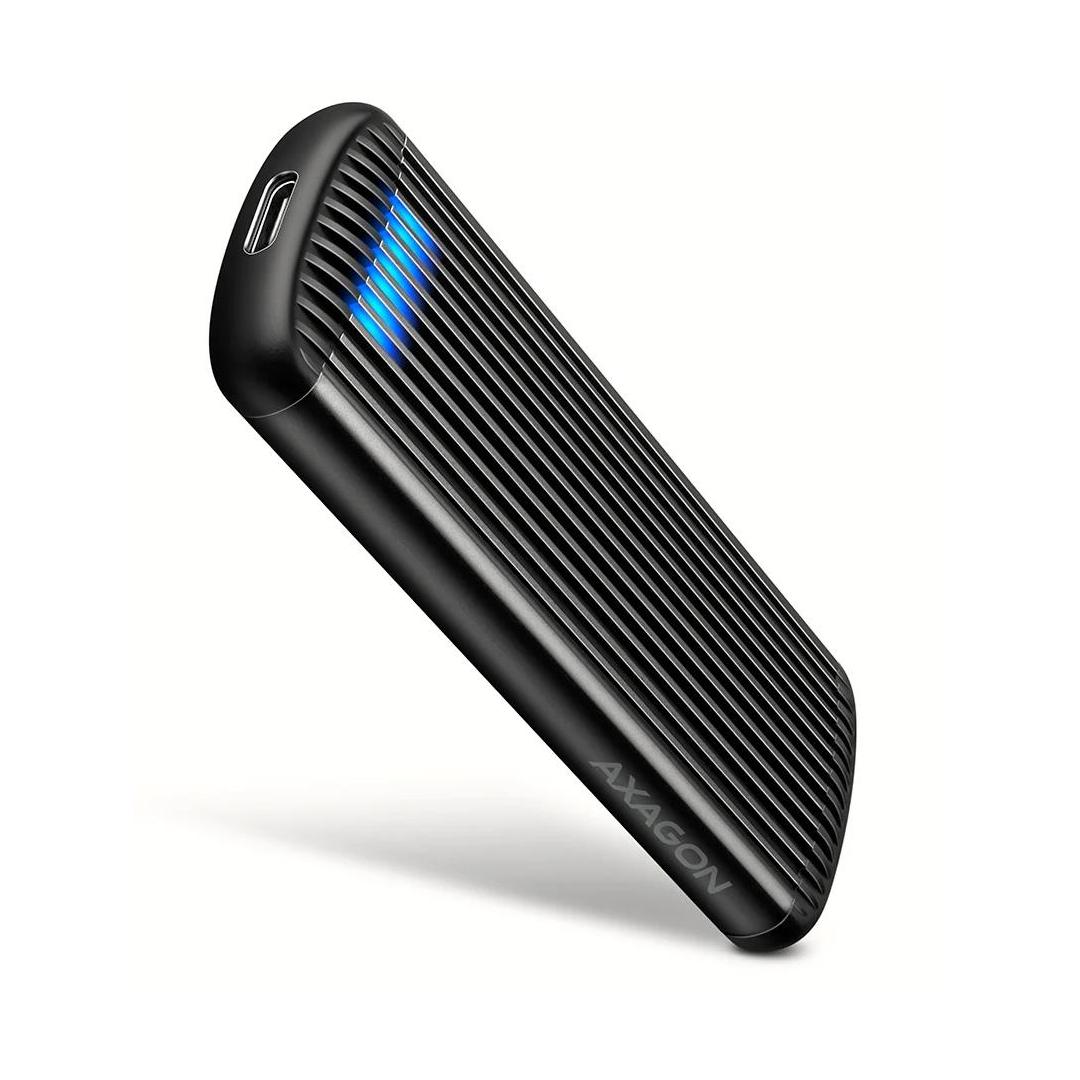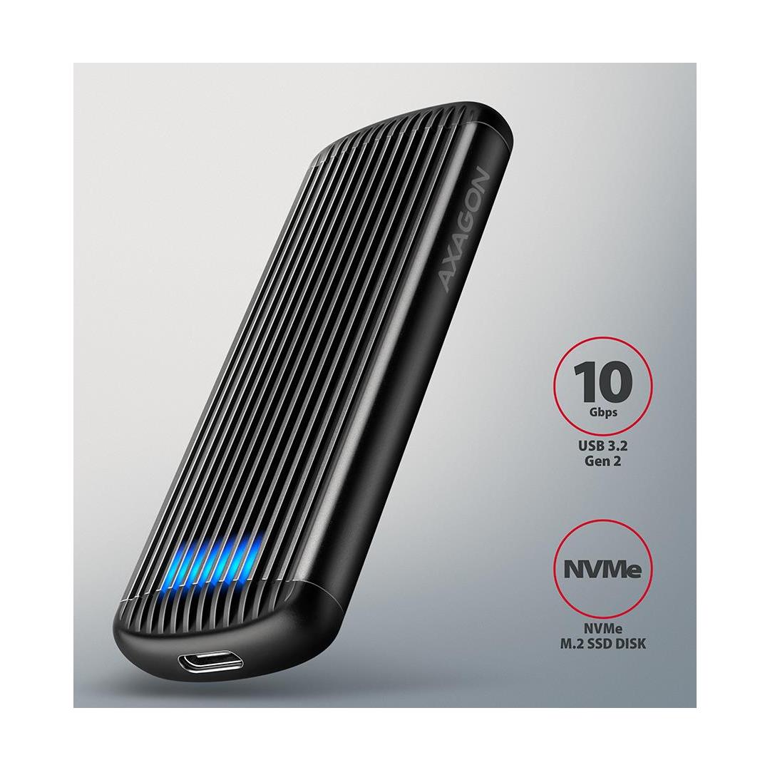 Aluminum external AXAGON EEM2-SC RIBBED box with USB 10Gbps interface designed for M.2 NVMe SSDs. A stable and fast connection is ensured by a reversible USB-C connector. In the package you will find a USB-C -> USB-C cable to connect the box to your computer.