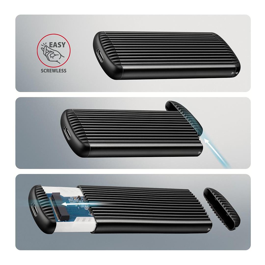 External USB-C 10Gbps metal box for M.2 NVMe SSD disks. Screwless opening.