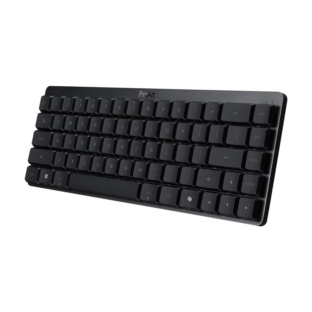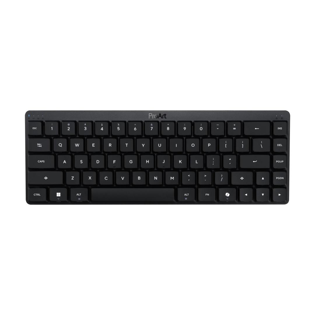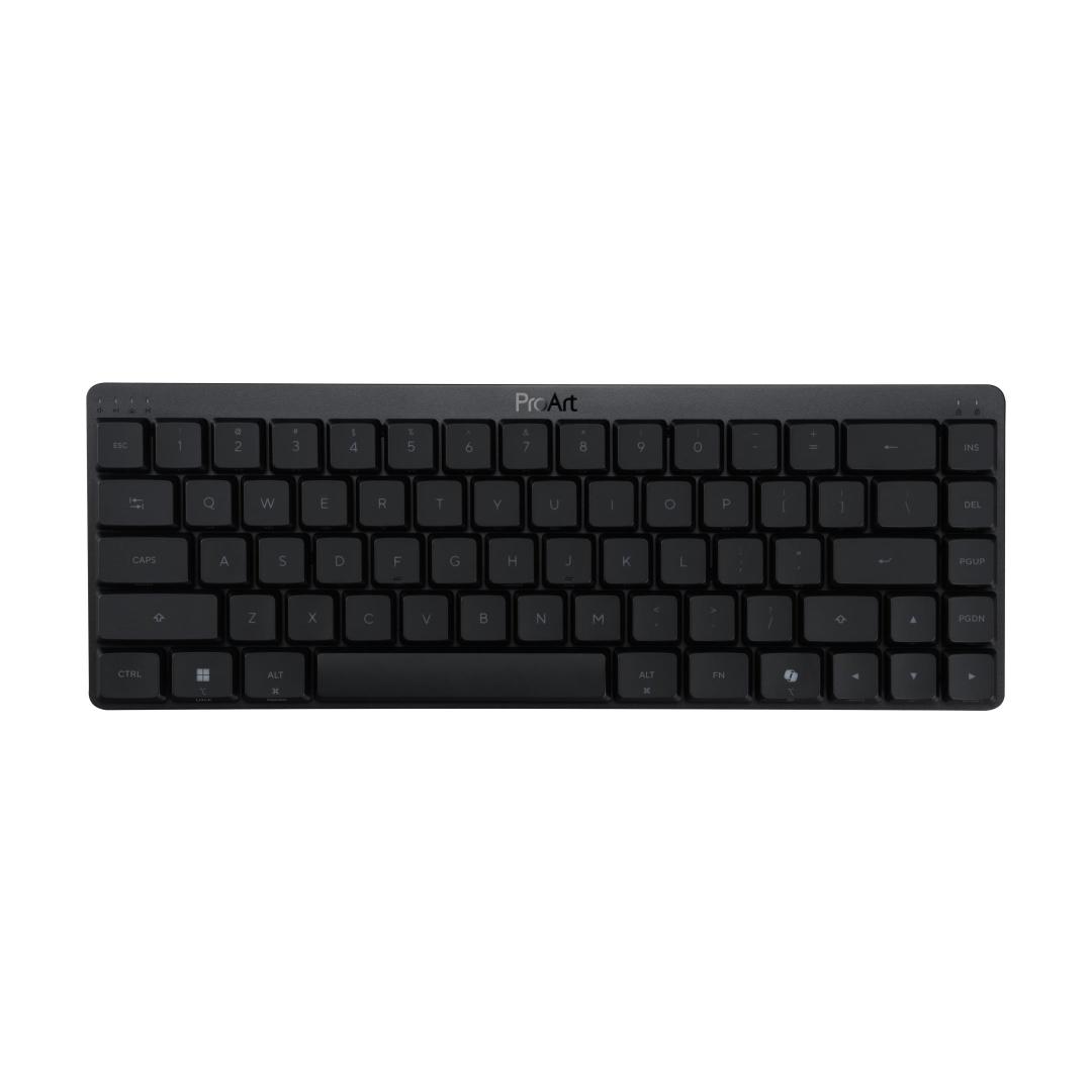 ASUS ProArt Keyboard KD300. Keyboard form factor: 65%, Connectivity technology: Wireless, Device interface: USB + RF Wireless + Bluetooth, Keyboard key switch: Mechanical. Backlight type: RGB LED. Cable length: 1.8 m. Recommended usage: Home/Office. Product colour: Black