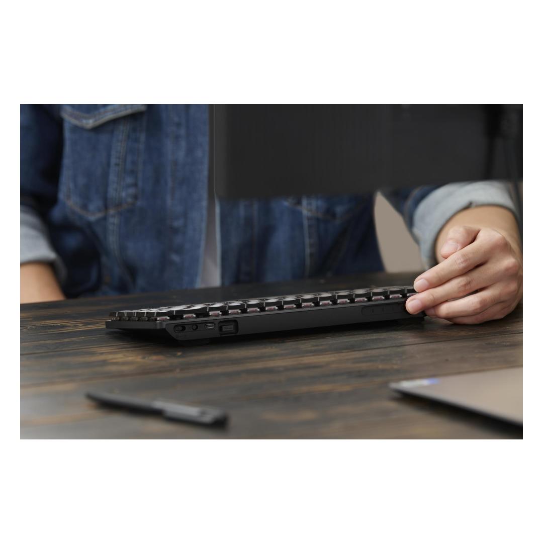 ProArt Keyboard KD300 is a 26.8 mm-slim, 65% low-profile keyboard with navigation keys and a premium aluminum top cover. This versatile keyboard features tri-mode connectivity to support up to five devices simultaneously via 2.4 GHz wireless, Bluetooth® and USB. For convenience, ProArt Keyboard KD300 has a PC/Mac toggle switch, a storage slot for its magnetic dongle, and an innovative touch panel for intuitive control of volume, media playback and lighting. Meanwhile, the web-based ASUS Gear Link interface allows you to customize profiles, key mappings, macros and lighting to personalize the keyboard for your creative workflows. ASUS RX Red Low-Profile optical switches deliver smooth, fast, and precise keystrokes, while two adjustable keyboard tilt angles ensure an ergonomic typing position.