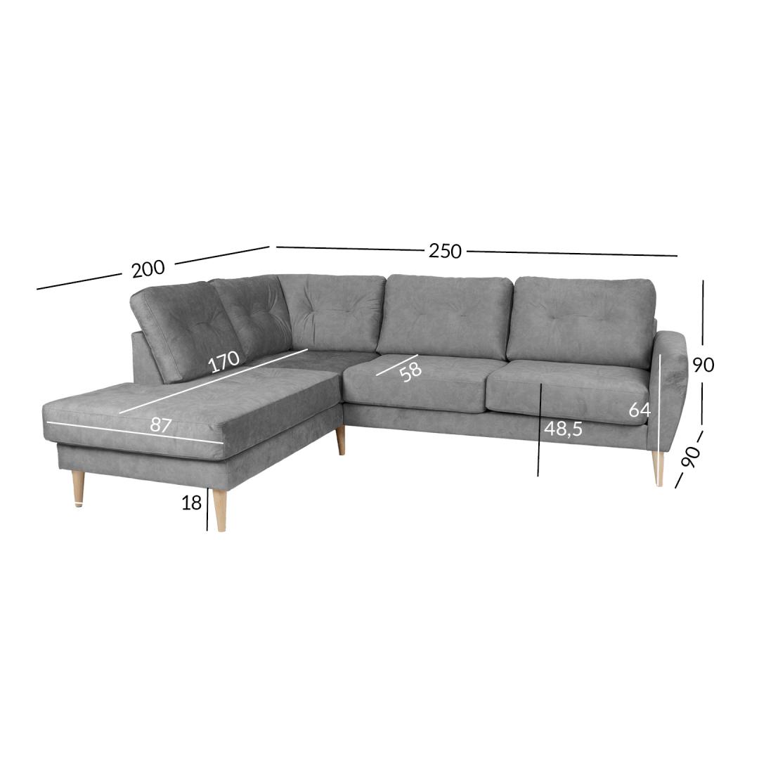 Diivani üldmõõdud: 250x200/90xH90cm. Istme laius 205cm, istme sügavus 170/58cm, istme kõrgus 48,5cm. Nurgaosa laius 87cm. Käetoe kõrgus maast 64cm.
