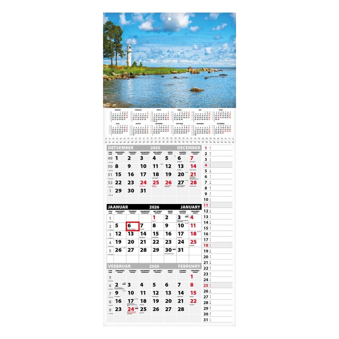 Настенный календарь с обзором трех месяцев. В открытом виде с изображением 297х630мм. Красный статический маркер даты. Календарь включает национальные праздники, национальные и национальные календарные годовщины, дни флага, 42 национальных праздника в виде сокращений, время восхода и захода солнца, фазы луны, начало времен года. Названия дней и месяцев на эстонском и английском языках. В правой части страницы есть поля для обозначения дней рождения или событий. При заказе со своим изображением и/или рекламной полосой цена меняется.