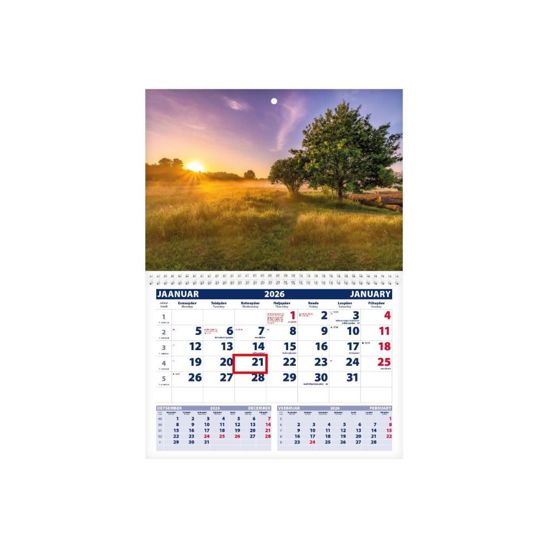 Настенный календарь с видом на Луну. В открытом виде с изображением 297х425мм. Красный статический маркер даты. Календарь включает национальные праздники, национальные и национальные календарные годовщины, дни флага, 42 национальных праздника в виде сокращений, время восхода и захода солнца, фазы луны, начало времен года. Всегда открыт на предыдущий и следующий месяц. Названия дней и месяцев на эстонском и английском языках. При заказе со своим изображением и/или рекламной полосой цена меняется.