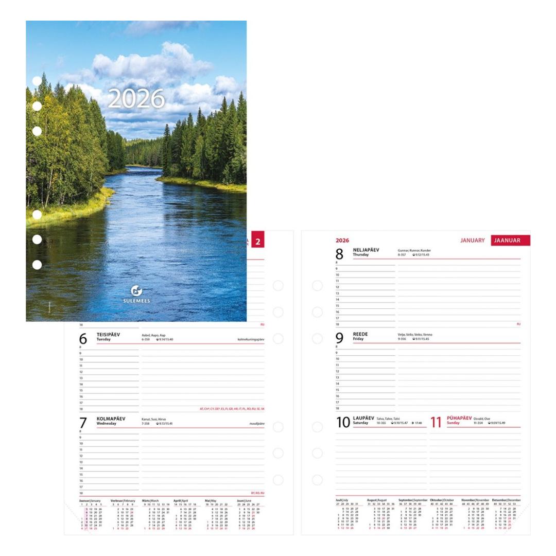 Еженедельный и горизонтальный календарь с 6 отверстиями для обложек в стиле Manager. Расстояние между отверстиями от центра до центра 19-19-70-19-19 мм. Страница. размер 142х202мм. Календарь включает государственные праздники, национальные и национальные календарные годовщины, дни флага, именины, 42 национальных праздника в виде сокращений, время восхода и захода солнца, фазы луны, начало сезонов, планы на текущий и следующий год, табличные календари для год, фонетические алфавиты, таблица перевода единиц измерения и таблицы для большинства стран мира о телефонных кодах, валюте, разнице во времени и т. д., 16 страниц эстонской карты.