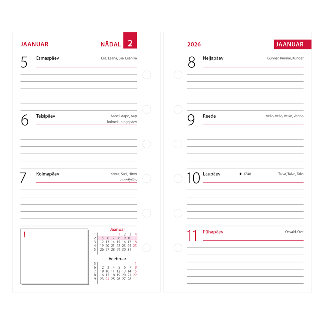 Еженедельный календарь с 6 лунками для обложек в мини-стиле. Расстояние между отверстиями от центра до центра 19-19-19-19-19 мм. Страница. размер 78х130мм. Календарь включает национальные праздники, национальные и национальные календарные годовщины, дни флага, именины, время восхода и захода солнца, фазы луны, начало времен года, планы на текущий и следующий год, табличные календари на год.
