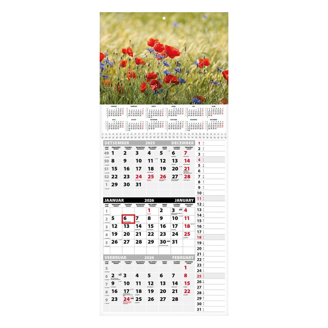 Настенный календарь с обзором трех месяцев. В открытом виде с изображением 297х630мм. Красный статический маркер даты. Календарь включает национальные праздники, национальные и национальные календарные годовщины, дни флага, 42 национальных праздника в виде сокращений, время восхода и захода солнца, фазы луны, начало времен года. Названия дней и месяцев на эстонском и английском языках. В правой части страницы есть поля для обозначения дней рождения или событий. При заказе со своим изображением и/или рекламной полосой цена меняется.
