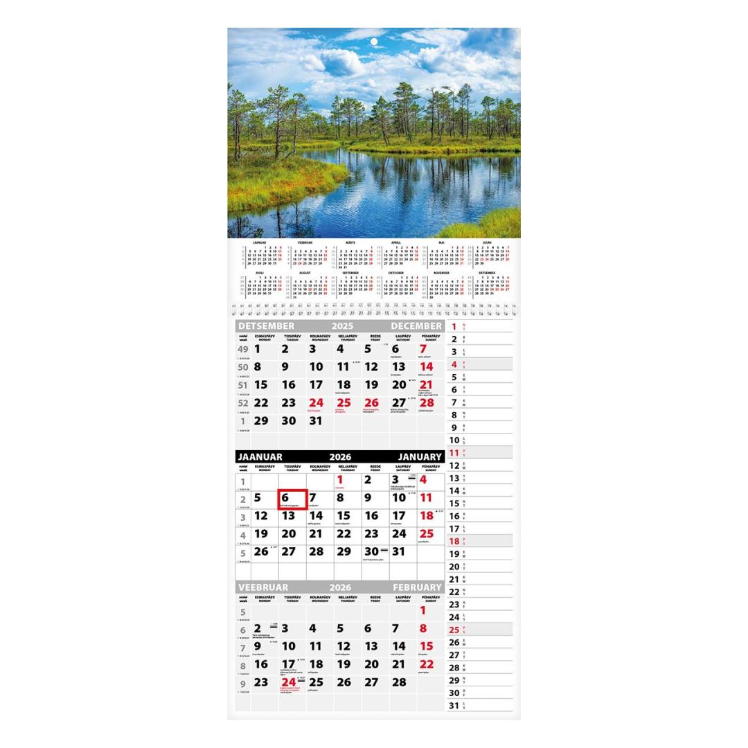 Настенный календарь с обзором трех месяцев. В открытом виде с изображением 297х630мм. Красный статический маркер даты. Календарь включает национальные праздники, национальные и национальные календарные годовщины, дни флага, 42 национальных праздника в виде сокращений, время восхода и захода солнца, фазы луны, начало времен года. Названия дней и месяцев на эстонском и английском языках. В правой части страницы есть поля для обозначения дней рождения или событий. При заказе со своим изображением и/или рекламной полосой цена меняется.