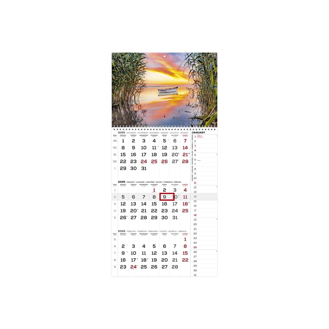 Размер: 297 x 630 мм Спиральный переплет Отверстие для подвешивания Объем содержимого 12 страниц Маркер даты Содержание темно-серый/красный Язык: эстонский, английский, латышский, литовский, финский, русский Календарь включает в себя следующее: Государственные праздники, национальные праздники 4 стран с сокращениями. (EST, LAT, LIT, FIN), фазы луны, знаки зодиака, предыдущий и следующий месяц, номер недели.